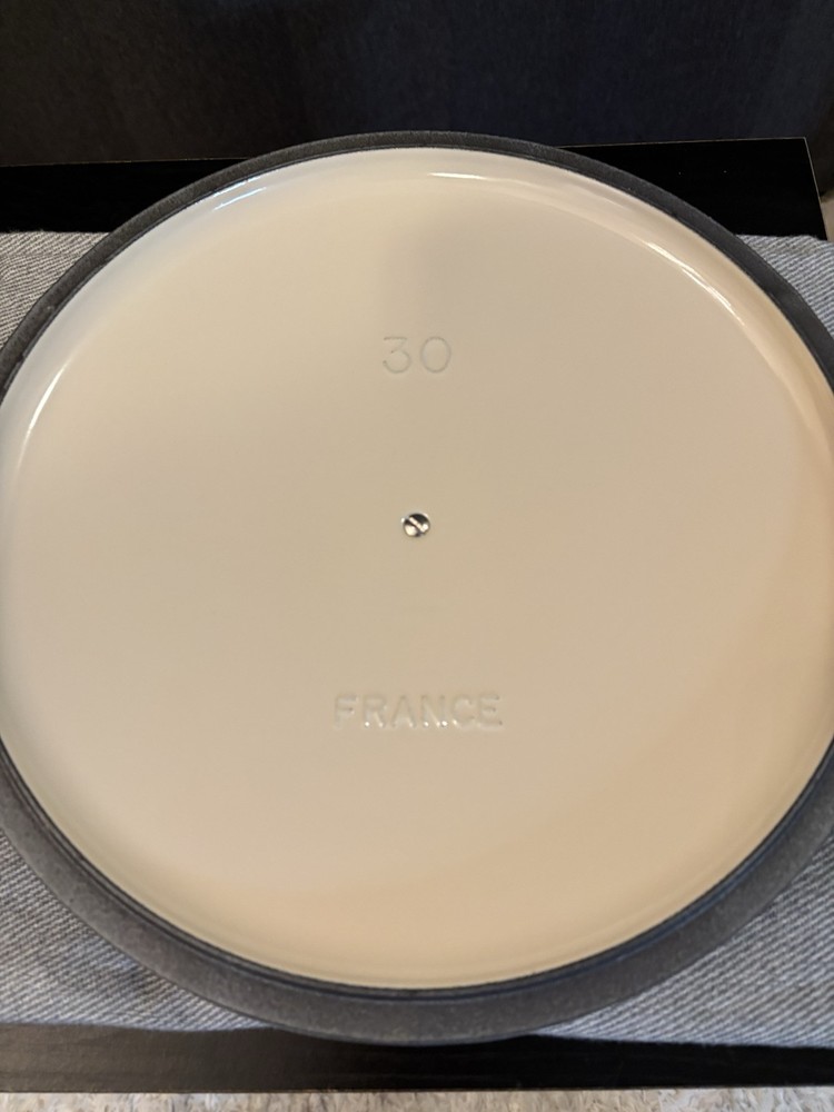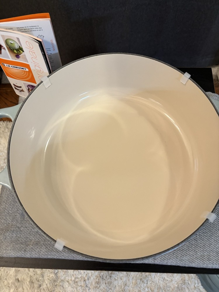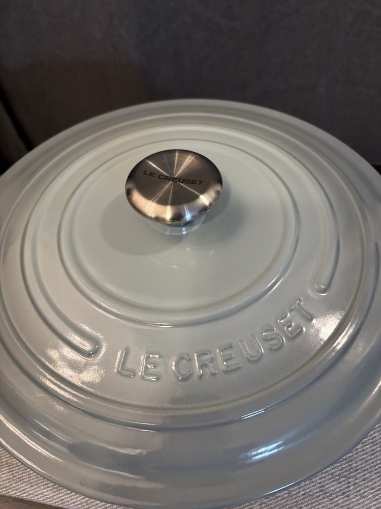 Le Creuset Signature Round Wide Oven, 6.75qt, Sea Salt Color Color: Sea Salt Size: 6.75qt Servings: 6-7 Enameled cast iron delivers superior heat distribution and retention Ready to use, requires no seasoning Easy-to-clean and durable enamel resists dulling, staining, chipping and cracking Light colored smooth interior enamel allows easy monitoring of cooking progress Tight-fitting lid is specially designed to circulate steam and return moisture back to the food Ergonomic knobs and handles are designed for easy lifting Lightest weight cast iron by quart on the market Compatible with all cooktops and oven-safe up to 500° Open box item