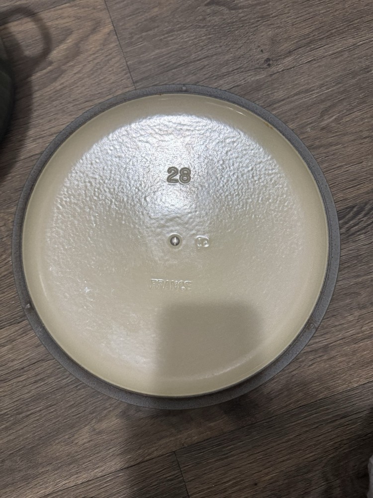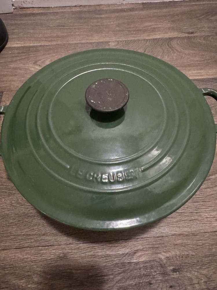 Le Creuset Signature Cast Iron Dutch Oven 7.25 Quart Artichaut Green Has Damage. Condition is Used. Shipped with USPS Ground Advantage.