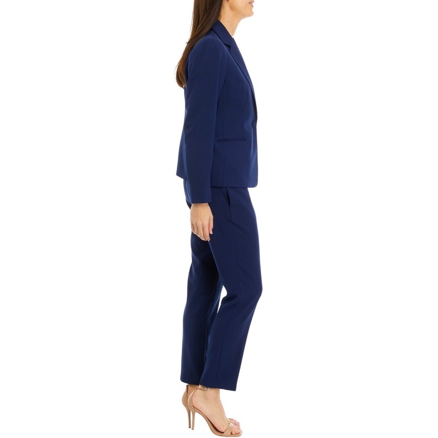 Le Suit Women Indigo Blue Crepe Classic One-Button Blazer Pantsuit Set Size US 4 New with tags MSRP $225 Jacket: Notch collar Single button closure at front Shoulder pads Side welt pockets Lined Length 25" Armpit to armpit 18" Sleeve 23.5" Shoulders 15.5" Regular pants Mid rise Slim leg Zip fly with hook-and-eye closure Side slit pockets Inseam 30.5" Waist flat lay 15.5" Shell: 97% polyester, 3% elastane Lining: 100% polyester Dry clean