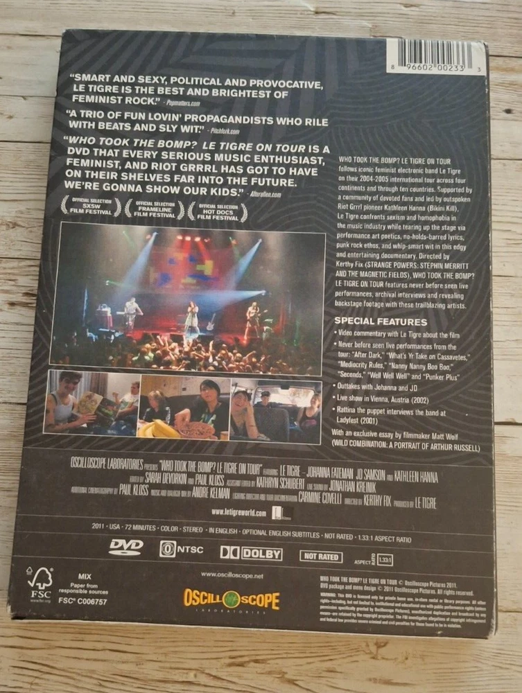 Run Time:72 min.Type:Live MusicSeller Notes:“In Very Good Preowned Condition.”Format:DVDgtin13:0896602002333Genre:RockRating:NRSub-Genre:Music Video (Concert/Performance)Studio:OscilloscopeRelease Year:2011Movie/TV Title:Who Took the Bomp: Le Tigre on TourUPC:0896602002333
