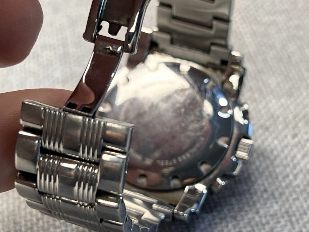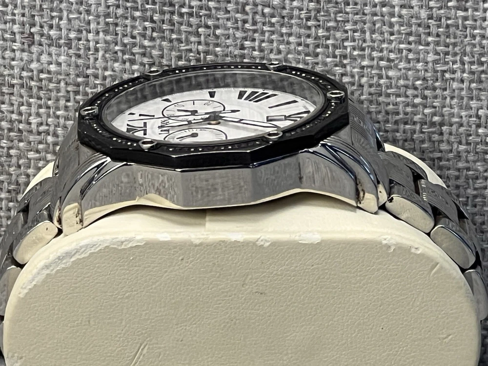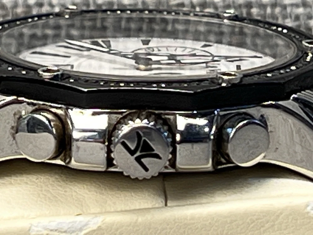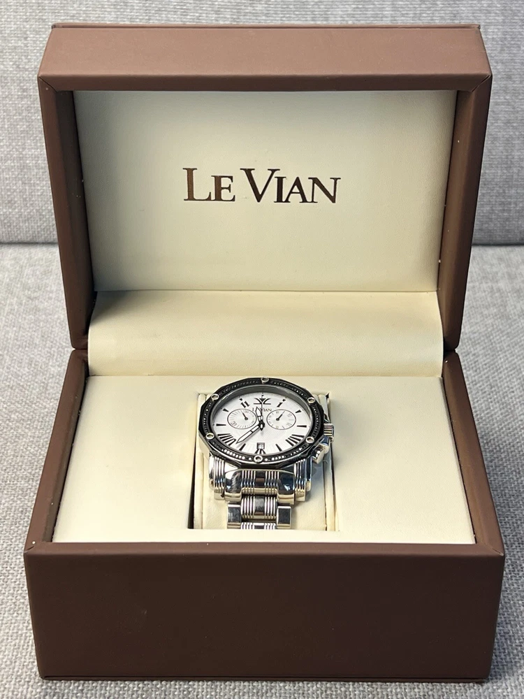 Features Black luminous hands, two chronograph subdials, date display, sapphire crystal, water resistant Case Polished stainless steel, 44 mm case, 12 mm case thickness Bracelet Polished stainless steel, 21 mm bracelet width Le Vian is a luxury jewelry brand that uses a variety of stones, including chocolate diamonds, which are pure diamonds with a coffee tint. The company guarantees that their diamonds and gems are natural and provides a written certification with details about each product