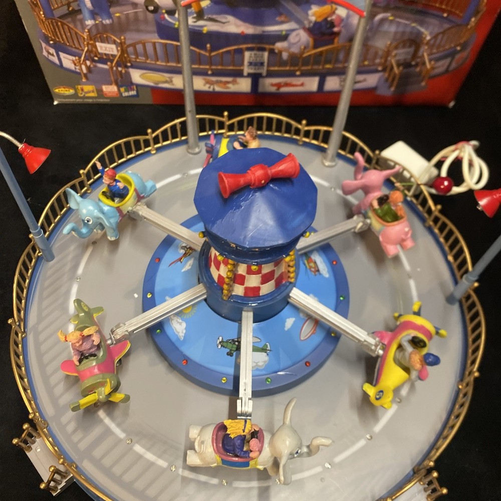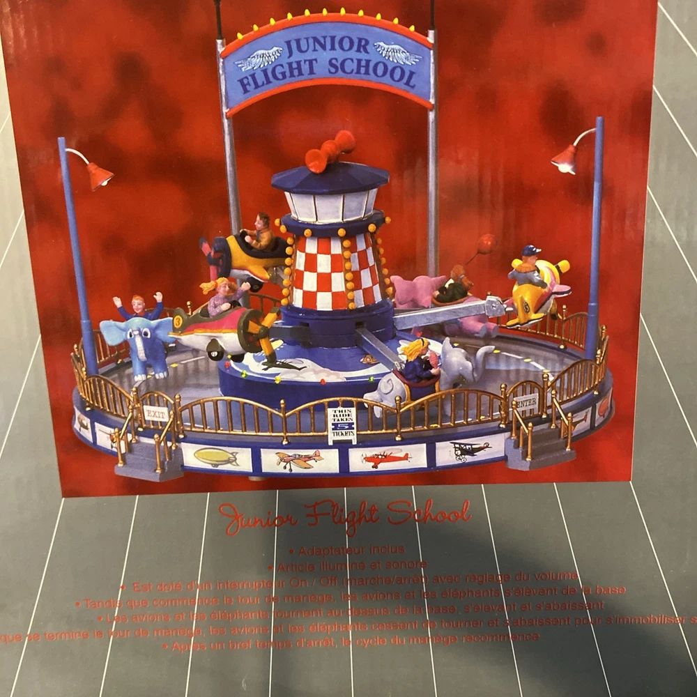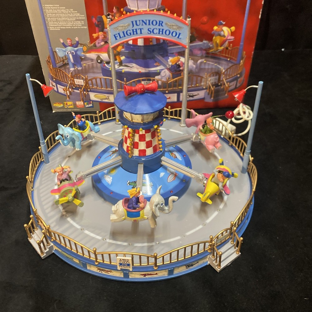 The LEMAX Village Collection Carnival-Junior Flight School is a colorful and detailed collectible from the 2000s. Made with mixed materials, this piece captures the whimsical charm of a junior flight school within a carnival setting. While it does not come with a power cord, it can still be a lovely addition to any holiday or seasonal display, bringing a touch of nostalgia and imagination to the collection. Missing the power cord, but in good cosmetic condition comes with original box and original Styrofoam packaging material Sold as is