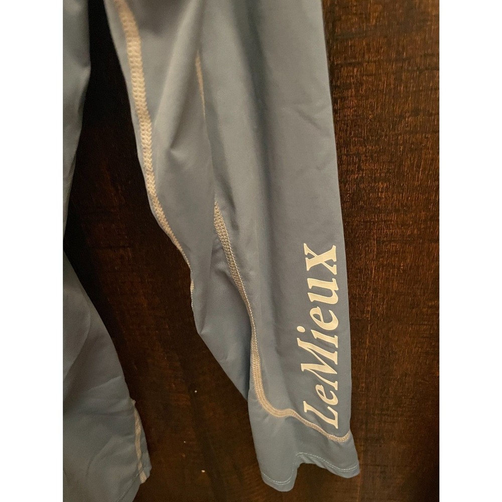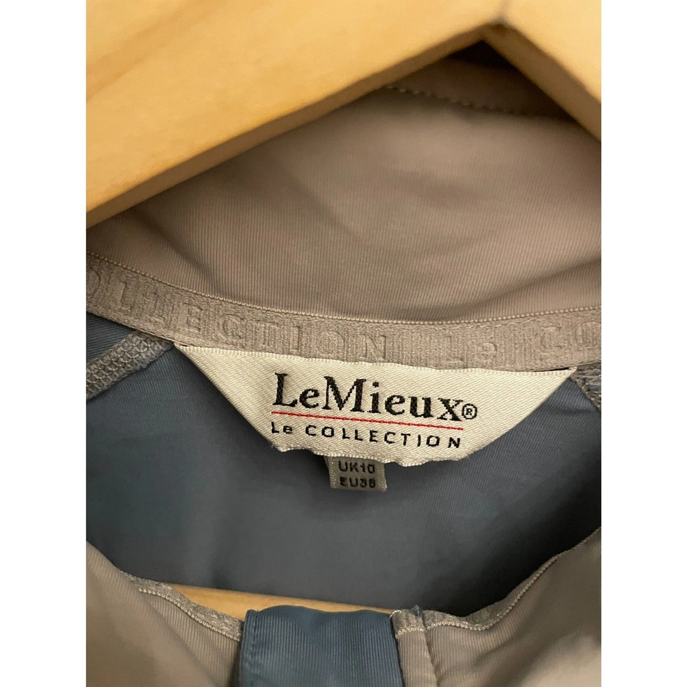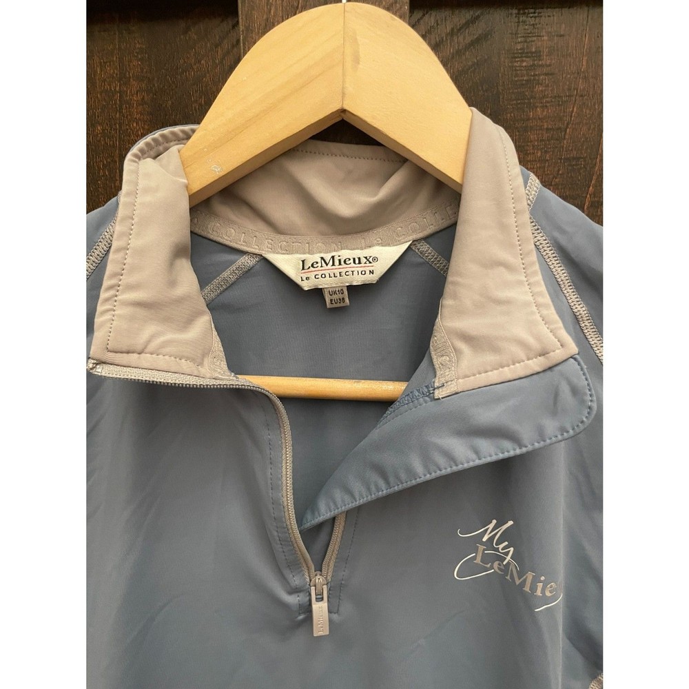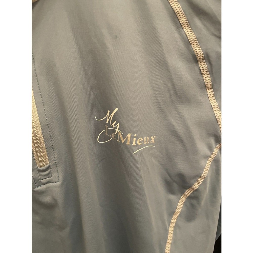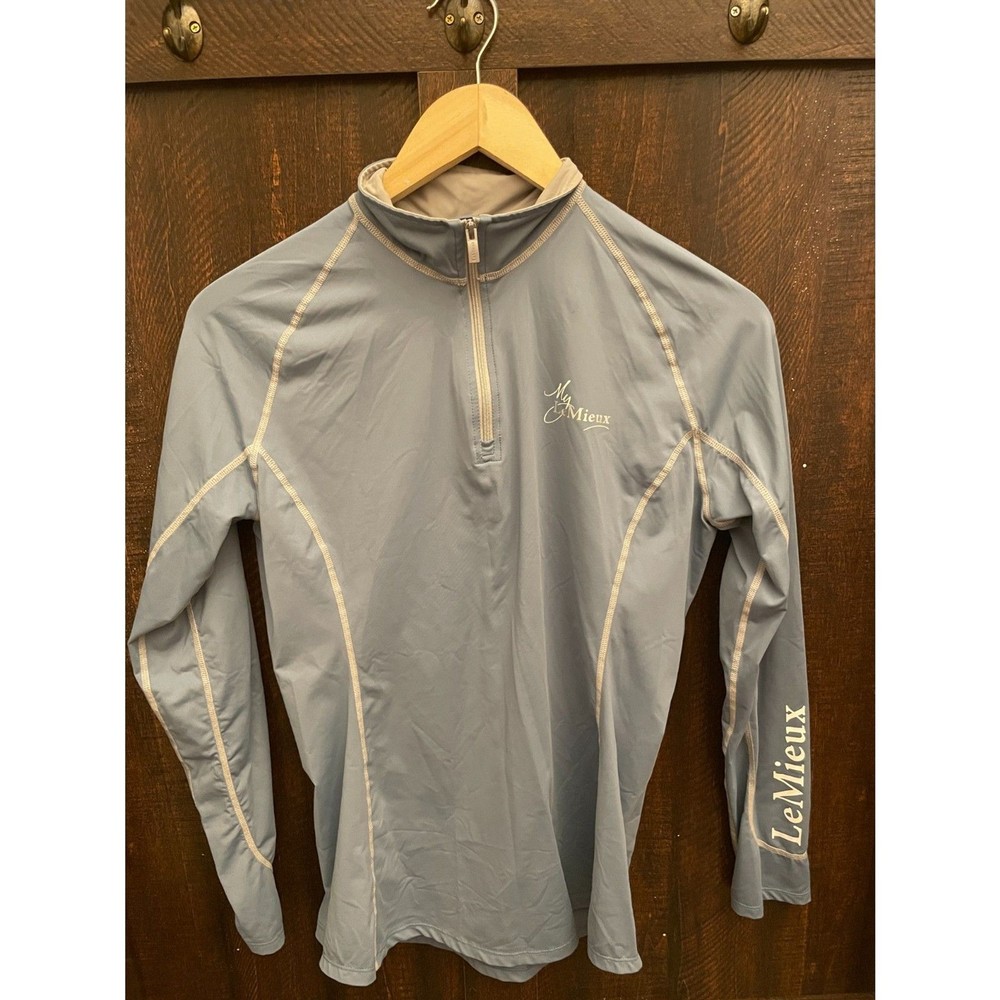 UK 10 US 6 Performance quarter zip riding top by LeMieux in a soft dusty blue color with light gray contrast trim and stitching. Features a fitted athletic silhouette, long sleeves, mock neck, quarter zip front, breathable stretch fabric, and LeMieux logo detail on the chest and sleeve. Perfect for horseback riding, training, hiking, running, gym wear, or casual athleisure outfits. The smooth fabric feels lightweight and comfortable while still giving that polished equestrian look. Tagged UK 10 / EU 38. Condition is good pre-owned with light wear from normal use. No major flaws noted. Please review photos for details and condition.