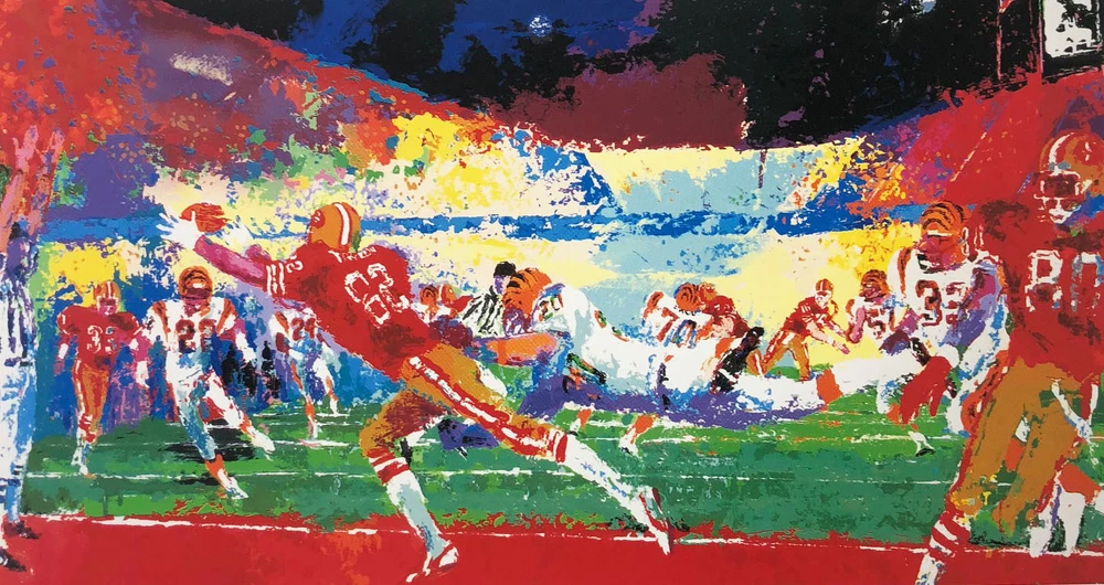LeRoy Neiman's " Super Play- Bengals/49ers " This print is: It is NEWLY CUSTOM FRAMED in a Great Black Wood Frame Double matted with black and white mats Outside Frame Dimensions measures approx: 17.5" x 16" Image Size measures approx: 6" x 9.5" FRAMING ALONE IS WORTH OVER $150! LeRoy Neiman (1927-2012) America’s Most Popular Sports Artist, a chronicler of contemporary lifestyles, and a master of the action-subject. Loved to also paint animals. His works are held in the Baseball Hall of Fame, Football Hall of Fame, The Art Institute of Chicago, The Portland Museum of Art, & The Hermitage Museum (Leningrad). He did a feature in the one of the Rocky movies as himself (painting the fight). His technique often started with his own impressionistic style and continues with a process style that looks very similar to the action paintings of the abstract expressionists.
