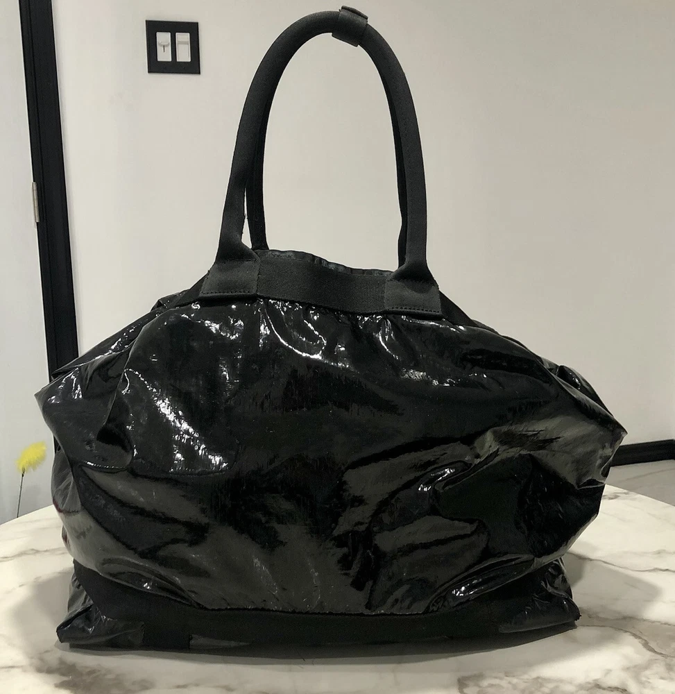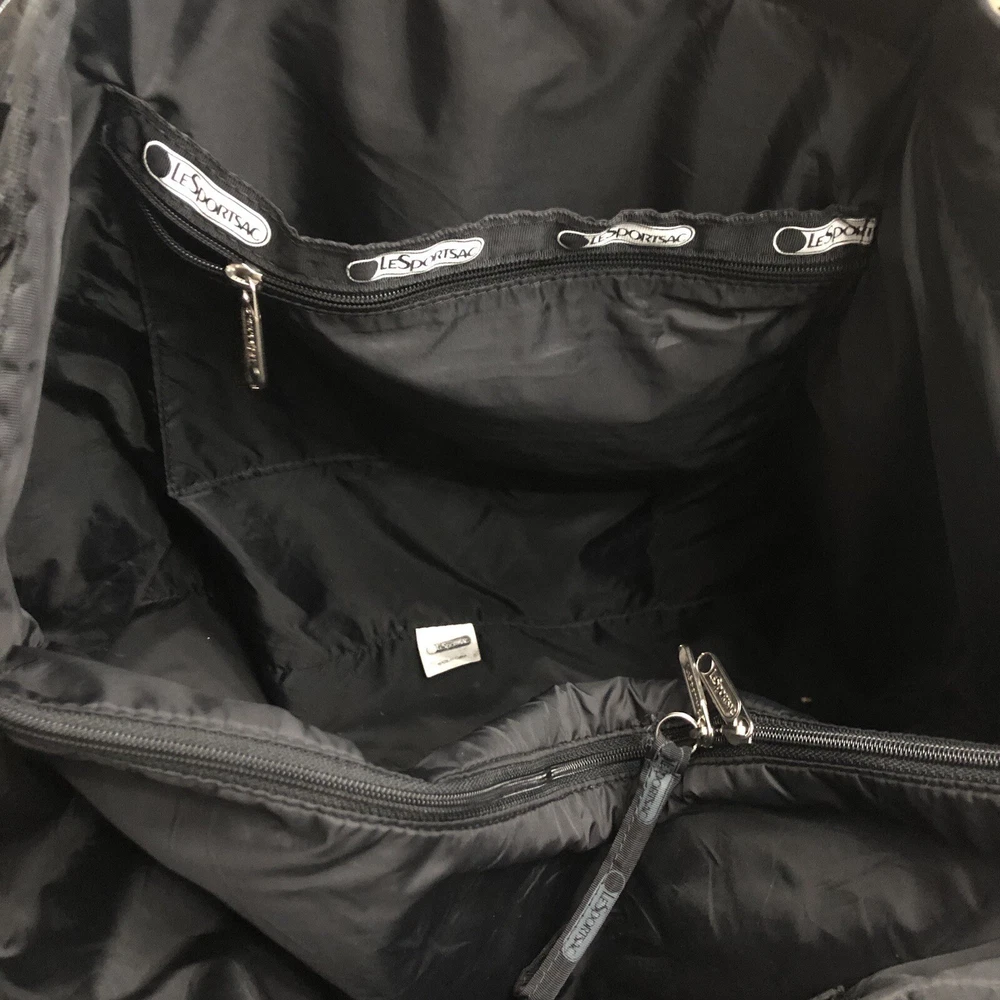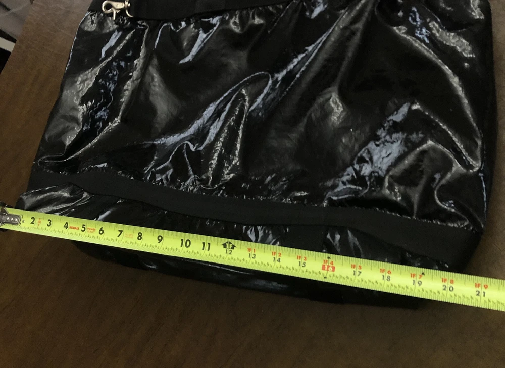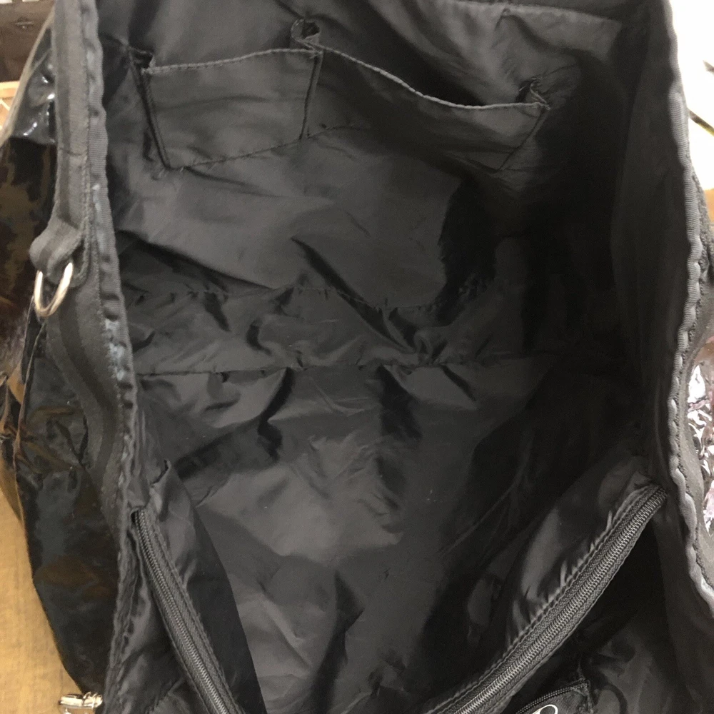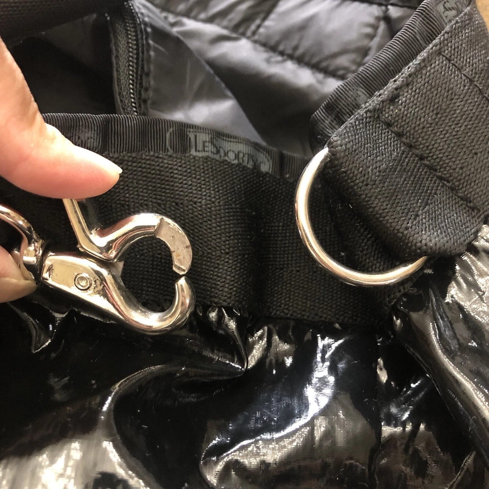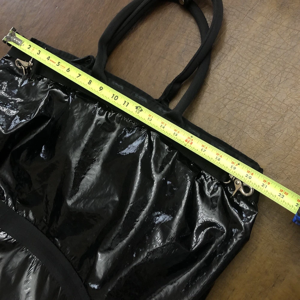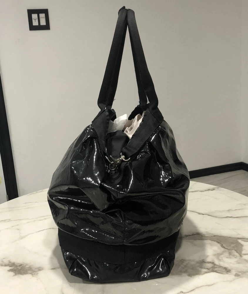 LeSportsac Deluxe Heavy Duty Extra Large Travel Bag Black Patent Rare! Retired! Bag is pre-owned in good condition! It has a very light scratch and peeling/wear on the bottom edges shown in photos! Not visible when worn. Bag is clean no snags. Measures approximately 21” L x 16” H x 7” D. The handle drop is about 7-1/2”. One zip closure middle compartment and two open compartments. Very lightweight and spacious. Each side has a claw hook to adjust top width. Approximate Measurements in photos! Thank you for stopping by!