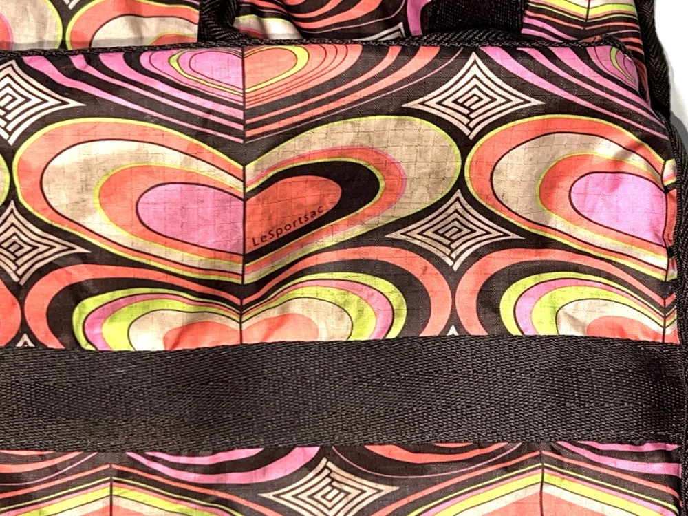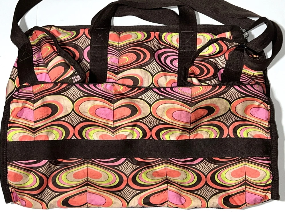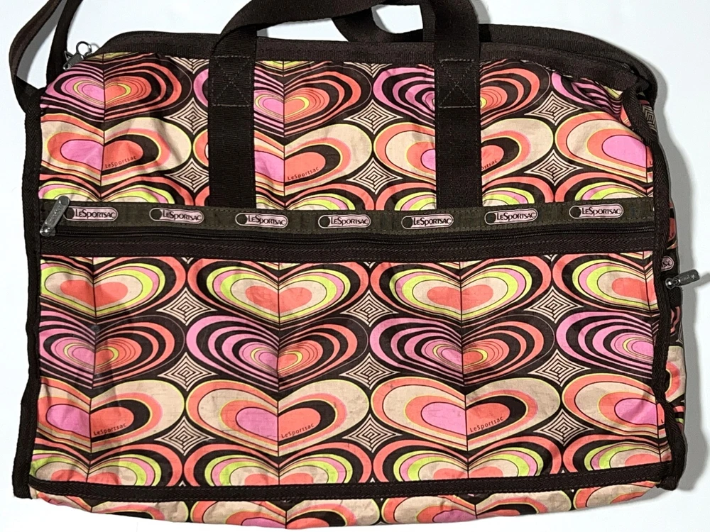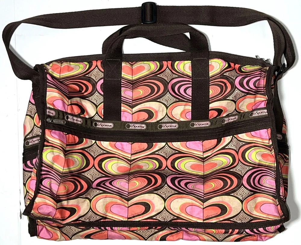 LeSportsac Pink Brown Hearts XL Duffle Travel Weekender Overnight Carryall Bag With Double Handles and Adjustable Shoulder/Crossbody Strap. Has 3 outside zipper pockets. Measures: 20.5" L x 13" H x 10 1/4" D. Great gently used condition with some spots on the inside, see pics.