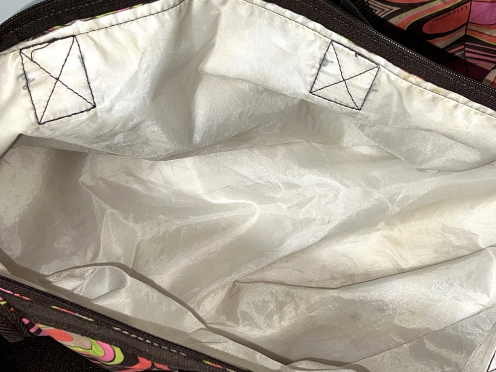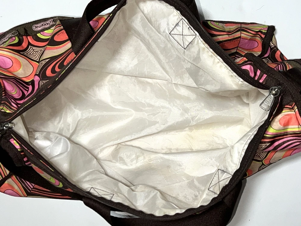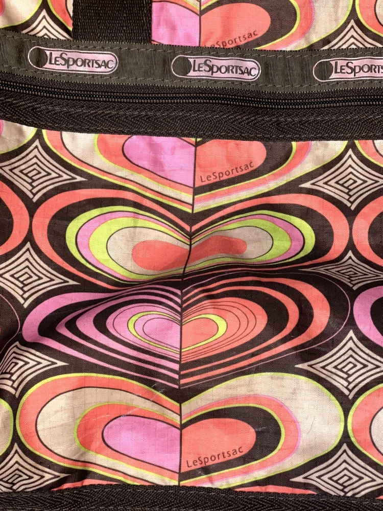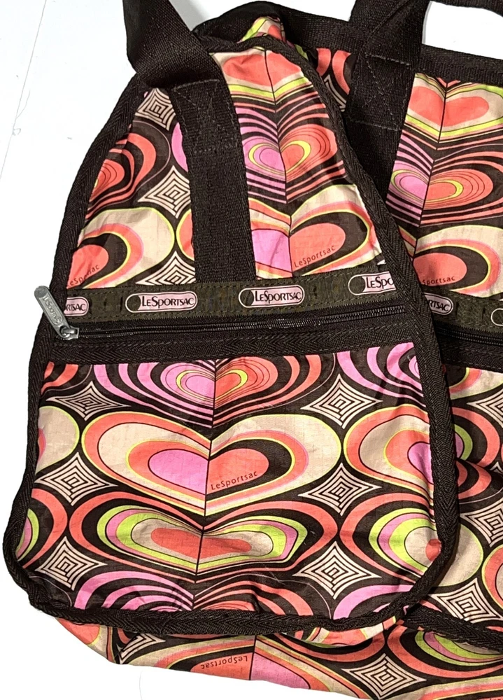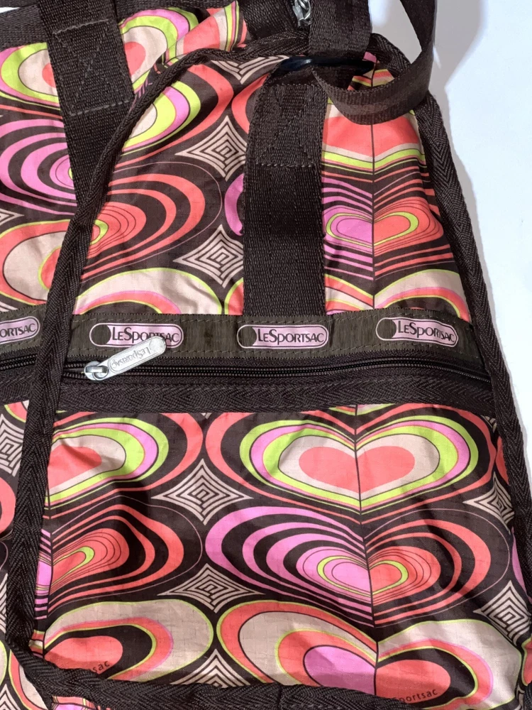 LeSportsac Pink Brown Hearts XL Duffle Travel Weekender Overnight Carryall Bag With Double Handles and Adjustable Shoulder/Crossbody Strap. Has 3 outside zipper pockets. Measures: 20.5" L x 13" H x 10 1/4" D. Great gently used condition with some spots on the inside, see pics.