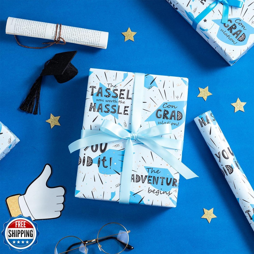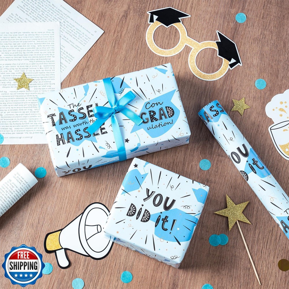 LeZakaa Blue Graduation Wrapping Paper Roll, You Did It!, The Tassel Was Worth The Hassle, Con GRAD ulation and Caps Design, Mini Roll, for Graduation Gifts Wrap, 17 inches x 16.4 Feet Features Celebratory Graduation Wrapping Paper: This cheerful and energetic wrapping paper features exciting phrases like "You Did It!" and "The Tassel Was Worth The Hassle," paired with a playful "Con GRAD ulation!" These motivating statements are set against a backdrop of graduation caps, stars, and confetti. The blue, gold, and black accents create a fun, celebratory feel, making it perfect for wrapping graduation gifts. Mini Roll: Measuring 17 inches wide by 16.4 feet long, this wrapping paper provides 23.2 square feet of coverage—perfect for wrapping several small to medium-sized gifts. Premium Quality: Crafted from high-grade coated paper, this wrapping paper is thick, durable, and tear-resistant. Each roll is carefully wrapped in shrink film to prevent scratches and dust, ensuring it arrives in flawless condition. Perfect for Graduation Celebrations: Ideal for a graduate about to embark on the next exciting chapter of their life. Whether it’s a high school or college graduation, this design perfectly celebrates the achievements and milestones reached. It’s perfect for anyone who’s about to start a new journey, filled with excitement and optimism for the future! Customer Care: We’re committed to your satisfaction. For any questions or concerns, feel free to contact us—your happiness is our priority. Shipping Free & Fast Shipping: We offer free shipping to most of the USA with a normal delivery time of 3-7 days. However, due to the current situation, additional delivery time (up to 3 weeks) may be required for some items. Alternative Carriers: We may use alternative carriers (e.g., USPS, FedEx, UPS) to ensure your package arrives safely and on time. Due to the use of multiple carriers, we are unable to provide a tracking number automatically. Handling Time: Orders are processed and shipped within 1-2 business days of receiving cleared payment. Shipping Restrictions: Shipping to Alaska, Hawaii, Puerto Rico, Guam, and other US territories may incur shipping charges or delivery restrictions. Please contact us before ordering, or your order can be refunded/cancelled. State Restrictions: Certain items may not be shipped to California due to state regulations. Contact for Tracking Updates: If you require tracking updates or have any concerns about the delivery of your order, please feel free to contact us, and we will be happy to assist you. Return Policy 30-Day Hassle-Free Returns: If you are not completely satisfied with your purchase, you can return the item for free within 30 days of receiving it for a full refund or exchange. Easy Return Process: Contact us, and we will provide you with a prepaid return shipping label and detailed instructions. No Restocking Fee: There are no restocking fees for returns. However, the buyer is responsible for return shipping costs if the return is not due to a seller"s error. Refund Processing: Refunds will be processed within 1 business day of receiving the returned item in its original condition. Feedback Your feedback is extremely important to us. We strive to provide the best products and customer service possible. If you are satisfied with your purchase, please take a moment to leave us a positive review. If you have any concerns or issues with your order, please contact us before leaving negative feedback. We are committed to resolving any problems and ensuring your satisfaction. Contact Us If you have any questions or concerns, please feel free to reach out to our customer support team. You can contact us through the eBay messaging system. We are available Monday to Friday, 9:00 am to 5:00 pm EST, and we will do our best to respond to your inquiry within 24 hours. Thank you for supporting our small family business!