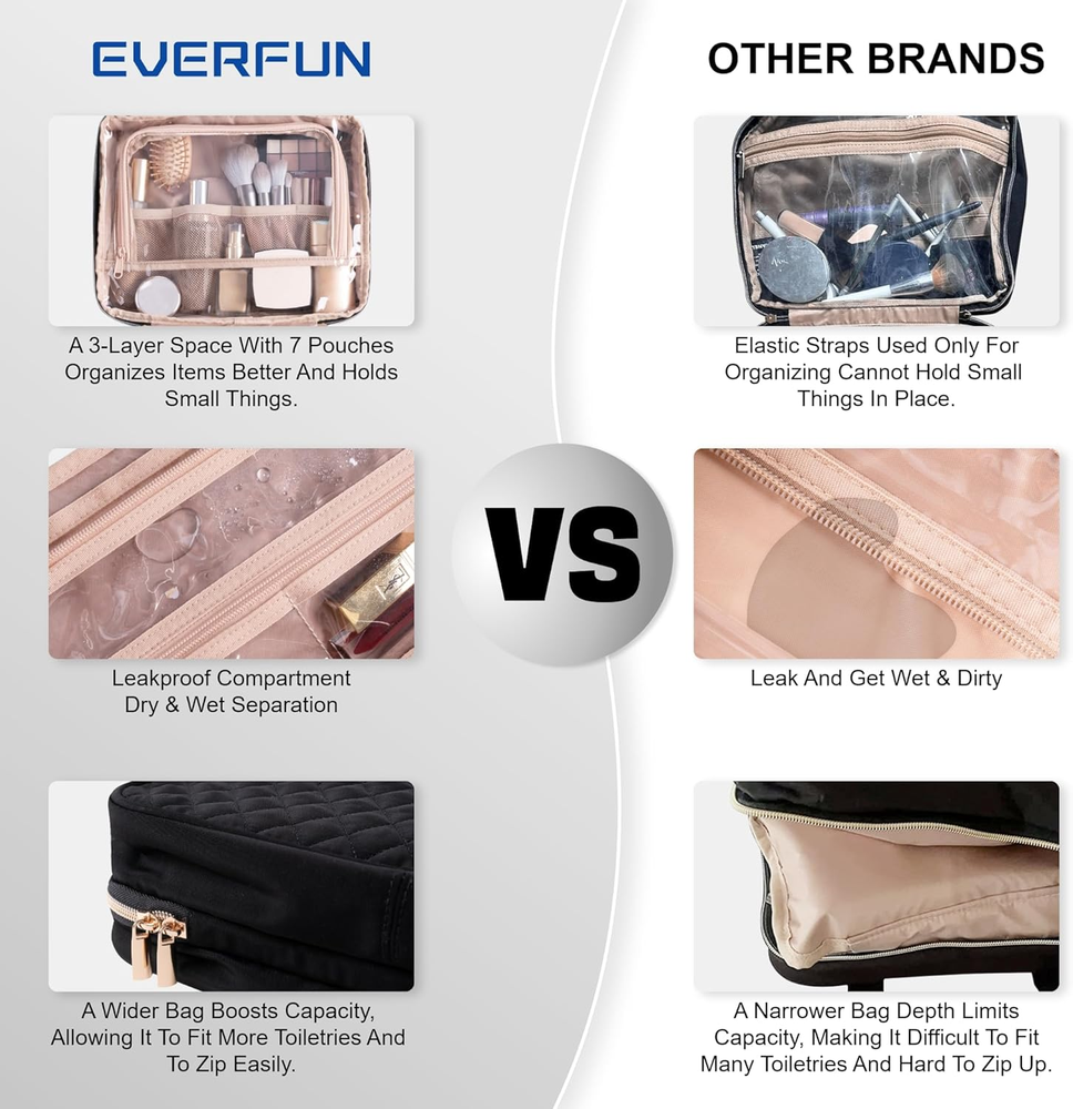 Store New Arrivals Add to Favorite View Feedback Contact Hanging Travel Toiletry Bag for Women Traveling with Leakproof Compartment Makeup Cosmetic Organizer Dopp Kit Travel Accessories Essentials Must Have Description Item model number EF-8011-02 Color Black Product Dimensions 12 x 9 x 4.5 inches Country of Origin China Item Weight 1.17 pounds Department Women Size Large STAY ORGANIZED & EASY ACCESS: This bag features 4 compartments, with multiple pouches designed for cosmetics securely holding small items; Elastic bands keep bottles upright; A front pocket offers additional storage and quick access to makeup essentials. DRY-WET SEPARATION: Independent leak-proof compartments in the first (top) and last compartments respectively, providing excellent protection and enhanced hygiene; Your toothbrush and towel can be stored after use without wetting other items. LARGER CAPACITY & CONVENIENCE: 12 x 9 x 4.5 inches (rolled), ample space for toiletries, makeup, pills, and more; The 360° metal hook enables versatile hanging, saving counter space; Transparent inner provides easy, full-view access to your belongings. UPGRADED MATERIAL: Features a U-shape zipper design with two-way metal closure for swift access; Water-resistant exterior and transparent inner, maintaining fog-free clarity; Reinforced stitching and heavy-duty material for durability and load-bearing. MULTIPURPOSE: EVERFUN's compact toiletry bag is ideal for women, girls, travelers, heavy packers, and makeup lovers; Use it as a portable makeup organizer, bathroom bag, or storage for daily life, travel, gym, weddings, cruises, and outdoors. Product Description The video showcases the product in use. The video guides you through product setup. The video compares multiple products. The video shows the product being unpacked. How durable is its hanging hook? The bag features a heavy-duty polyester construction complemented by a robust 360° metal hook, all designed to ensure maximum durability and reliability. Are its compartments leak-proof and waterproof? Yes, the bag's compartments are designed to be both leak-proof and waterproof. However, zippers aren't fully waterproof. Wring out wet items like towels before storing to prevent seepage. Is its interior easily visible and accessible? Yes, the compartments are totally see-through, and they have these elastic bands that keep everything in its place, making it really easy to find what you need. Are its compartments spacious for full-sized bottles? Yes, it has large capacity with organized compartments, it can fit full-sized products. You can easily put full-size shampoos into one compartment. What are the dimensions and weight of this toiletry bag? The large size measures 12x9x4.5 inches and weighs 1.16 pounds. The medium size is 11x8x4 inches and weighs 1.04 pounds. Both sizes offer larger capacities compared to other products, allowing them to hold more toiletries. ABOUT US We offer the best prices around on high quality products. Our E-store includes media such as books, movies, music and games while offering electronics, toys, sporting apparel, clothing, tools, general home, garden items and more. SHIPPING We are always working hard to ensure your package arrives as soon as possible. Please understand that some factors like weather, high postal traffic, and the performance of shipping companies are outside of our control. We offer free shipping to the lower 48 states and ship within 2 business days of payment, usually sooner. We do not accept P.O. Boxes. Please provide a physical address. For shipping outside of the continental USA, we only use eBay's Global Shipping Program.The item is shipped to KY and then sent to the rest of the world. International customers are responsible for all duties and taxes. Continue to check out in order to calculate costs for shipping the item to your country. Messages regarding eBay's Global Shipping Program MUST be directed at eBay EXCLUSIVELY. RETURNS We offer a 30-Day Return Policy on items which you are not completely satisfied with. You have the option for a full-refund or an exchange of the item. No returns are available on items shipped outside of the USA. PAYMENT We accept PayPal. CONTACT US This page content is yet to come Please ad us to your favorite seller and visit again later Thank You CUSTOMER SATISFACTION We try our very best to make sure every customer is completely satisfied. If there's a problem, message us! We're happy to help. WE ACCEPT Copyright © 2021 AutoDS. | All Rights Reserved