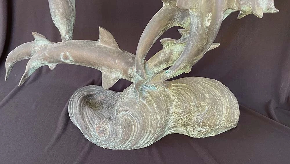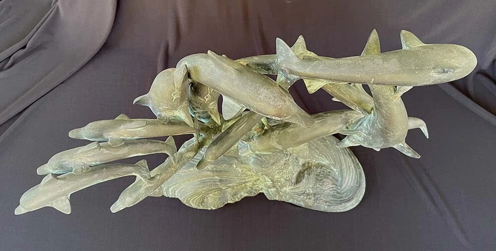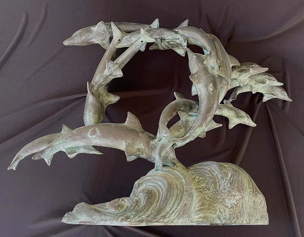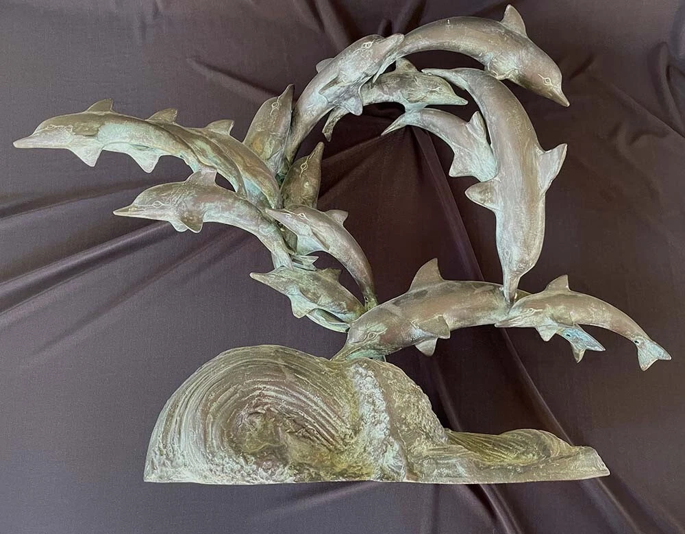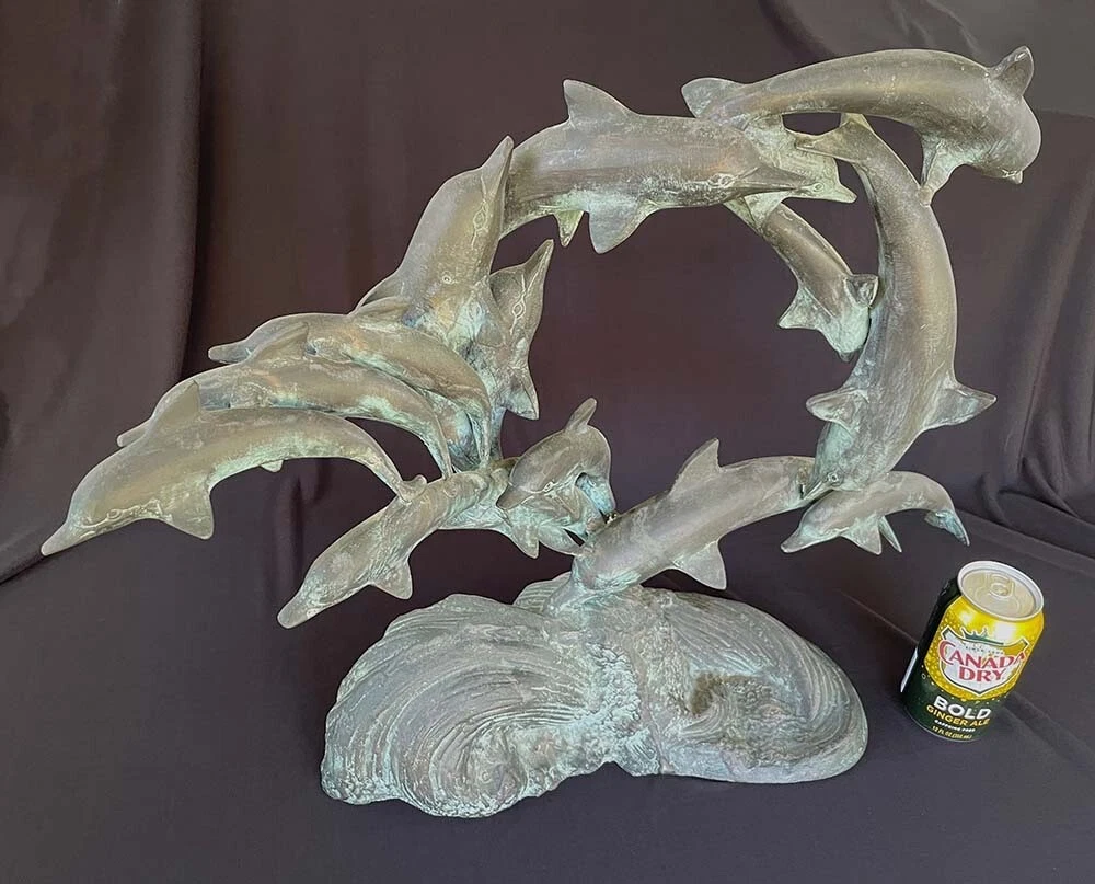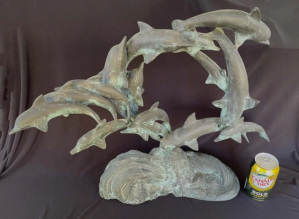 This is a large size stylish 15 dolphins sculpture in verdigris bronze (perhaps mixed metals) color. It measures about 24 inches wide, 19 inches tall and 8 inches deep. It weighs about 16.5 pounds. I do not see any mark or signature but it appears to be very well made. Condition is previously owned and as shown! A can of soda is placed for size reference and not included. Shipping cost is due to the bulking size, expensive shipping and the necessary insurance for your protection. I will probably ship via UPS Ground. * * * Non-smoking environment! * * *