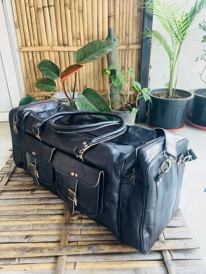 Each bag is individually made using goat leather by experienced crafts people .The bag gets better and better with the time as the leather softens and deep-ens in color. The tonality color of each bag might vary in accordance with the low and high temperatures from the heart of The Thar desert.The leather does not receive any chemical treatment. On the bags a special vegetable oil is applied to give more tonality to the dominant brown (light and dark) color of the bag also making it more resistant to the water.Each bag has its charm and style and a very special earthy smell that will assure you it’s real leather.Its lightness, flexibility and durability will not make you regret your purchase. For Sale Beautiful Genuine Vintage Leather Handmade Duffle Bag FOR TRAVEL,GYM & WEEKEND BAG Features 30X11X11 inch Medium Green canvas fabric 100 % genuine leather with canvas lining,Stylish and light weight For Internal 1 Large compartments Front Have 1 Big Pocket Side 2 Large Pockets With Zipper Made from the finest Hunter Goat leather and lined with high quality canvas this bag is hand crafted by artisans working with leather for decades Rustic Vintage look which makes each bag unique ( just like the person who owns them ) Perfect Accessory or Gifts for all Professionals , students , artists This is perfect to use as a: travel bag for men leather, travel bag for women leather, duffle bag leather, leather gym bag, holdall bag leather, leather bags, leather weekend bag, business leather bag, leather luggage bag, leather crossbody luggage bag, leather gym bag for men Adjustable strap (See the picture for more detail) Strong, light-weight goat leather, tanned without the use of chemicals Leather softens and darkens with use Color and texture of the leather varies Natural real leather smell, just like a luxury car or lounge suite Solid brass buckles and fixtures - will last for years Has a wonderful natural look, and feel Each bag is uniquely individual due to slight color and marking variations on natural leather Payment Using Paypal is the simplest and easiest way to pay, and is the way we prefer, but if you have a reason that you don't want to use Paypal that's OK, we will accept credit card payments and bank deposits, please contact us to arrange these after purchasing. we know that you will want to get your goods sent quickly so please remember to make your payment quickly after purchase, and we will dispatch within one business day after you have made your payment. if you need a bit of time to make your payment, that's also ok, please contact us to advise how long you need, we are happy to hold your goods for up to week before you pay. if you are purchasing from overseas,please be aware that we can only accept Paypal. Shipping · We will shipping the product; depend on purchase date of product. We will ship your product Within 2 Days By USPS/DHL Courier. WE SHIP THIS PRODUCT TO ONLY USA BUYER'S · It's not our responsibility about custom duty of your country. · Kindly check/verify custom charges of your country before purchasing. · We will provide the tracking information the next day of purchasing. · We will not able to shipping Festival holiday and Sunday. · We normally shipped your product, six working days, Monday to Saturday. Terms Of Sale Returns accepted · Customs duties and other duties levies in destination country are responsibility of the customer. · We will exchange the item if returned to us within 30 days of original packing. The item should not be used. · Buyer must inform within Two days after getting the product about any Issues with the Item. Please write to us before returning the item Buyer should contact us within 60 days of receiving the item Refund will be given in refund or replacement on buyer's choice. Return shipping will be paid by the buyer Item must be returned in its original condition Please write to us for any clarification on RETURN POLICY. About Us Namaste........ We are manufacturer and wholesaler of leather goods and specialized in Office Briefcases, Office Bag, College School bags, Travel Bag, Handbags, Purses, Wallets, leather journals and diaries and many more. We use quality leather of Goats and Camel. We offers customize designing and wholesale prices for bulk order. For more details, please write to us. Please contact us via eBay with any questions you have about our products. We normally respond to any questions within one or two working days.