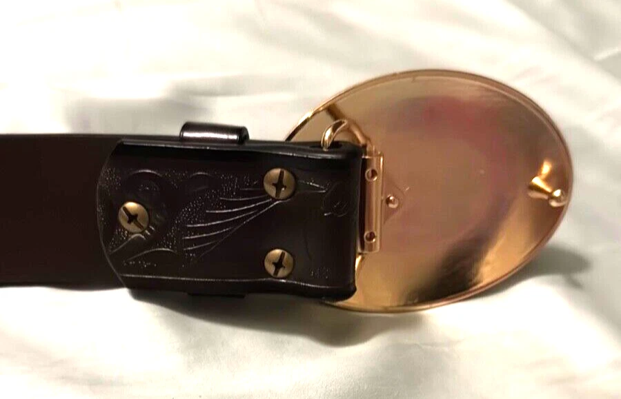 A Western-style unisex leather belt in brown, size 34, featuring a scorpion buckle with horse stamped embellishments and a flower themed buckle design, featuring a real scorpion encased in resin. This belt is perfect for those interested in a cowboy or western-inspired look.