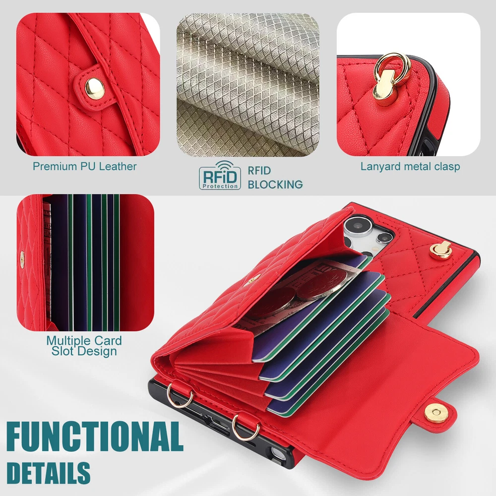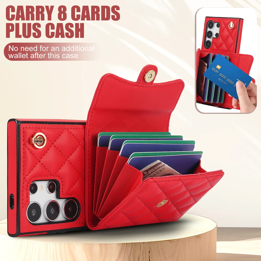 Leather Case For Samsung Galaxy S24 Ultra S23 FE S22 w/ Back Card Wallet+Lanyard Product Features: Premium Leather Design: Crafted from high-quality leather, this case for iPhone offers durability and a luxurious appearance while providing excellent protection against scratches and daily wear. Back Card Wallet for 8 Cards: The integrated card wallet holds up to 8 cards securely, combining style and practicality to eliminate the need for a separate wallet. Kickstand Functionality: Equipped with a built-in kickstand, this case enables hands-free viewing, making it ideal for watching videos, video calls, or reading on your iPhone. Hand Strap & Shoulder Strap: Includes a detachable hand strap and adjustable shoulder strap for versatile carrying options, providing convenience and security during travel or daily use.