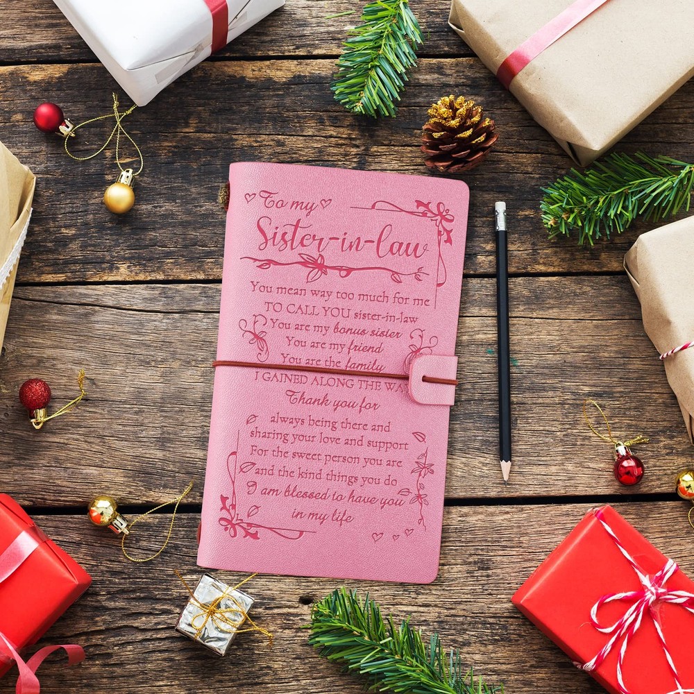 Leather Journal Notebook Gift Using journal notebook to express your love for your loved ones! High-quality leather makes our leather diary more durable. Fine paper:The paper will not scratch or penetrate. The right size:Convenient to carry around can be also used as a wallet or handbag. Multifunction:Additional cellphone slot & card slot. Perfect Gift:Great Gifts for Birthday / Anniversary/ Mother's day/ Valentine's Day/ Special occasion, it is an excellent way to record life. Sister In Law Birthday Gifts: An Engraved journal reminds your sister of your love for her, Ideal gift on Anniversary, Birthday, Travel, Reunion, Wedding, Christmas, or any Special Occasion. Perfect Sister Gift: It is proof of love for a sister and a commemorative gift for sister. She will be very moved when she received such a gift and it will undoubtedly catch her heart. So that your sister can think of your love for her at any time and cherish it. Personalized Sister Notebook: The size of the sister notebook is suitable for carrying computer bags, backpacks, handbags, shoulder bags, and large pockets. It is easy to carry and use outdoors, on the way to travel, or in the office. High-Quality Leather Journal: The journal notebook has the right size 7.9 "x 4.7", leather material, retro appearance, smooth touch, 140 pages of refillable paper including mobile slot and card slot. Multifunctional Journal: journal can be used as a diary, planner, travel journal, bullet journal, school journal, business notebook, executive notebook, office notebook, etc. Whether your sister wants to take notes at work, keep a diary, take travel notes, draw or sketch, this journal is a great choice.