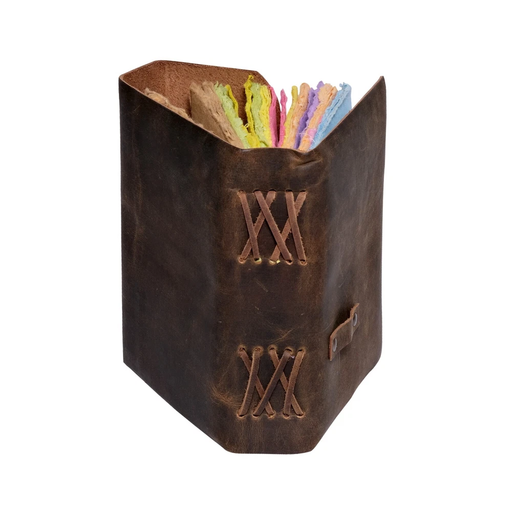 ✔ VINTAGE HANDMADE COLORED PAPER - Rustic Scrapbook Journal is made with 240 pages of Antique Paper which looks like it was pulled from a fantasy. You love the Multicolored antique handmade cotton paper in 7 colors all the colors are mixed and very unique you will love colors which is unique to our journal Notebook. ✔ USE ANY PEN - Sketch, Doodle, Write on your Leather Bound Journal with a Calligraphy Pen Fountain Pen, Brush Pen, Ball Pen, Acrylic Colors, Watercolor, and many more. Paste photos, clippings, recipes, scrap, etc. onto the parchment-style pages. We guarantee no bleed-through. ✔ STURDY BINDING FOR YOUR KEEPSAKE: Strong hand-stitched leather binding keeps the pages securely bound to the genuine leather cover. Pages will never come loose. ✔ THE PERFECT GIFT: You might want to keep the journal to yourself when you put your hands on the soft and supple leather so get two! It's perfect for a personal diary, Wiccan journal, witchcraft supplies, photo album, scrapbook, and junk journal. ✔ ECO-FRIENDLY BY NATURE: A lot of thought went into making sure the journal had a positive environmental effect. So, we decided to use only 240 pages/120 sheets of handmade, hand-torn, non-refillable recycled deckle edge cotton fiber paper that is thick enough to withstand any type of pen. Our paper is acid-free and no trees were harmed in its making.