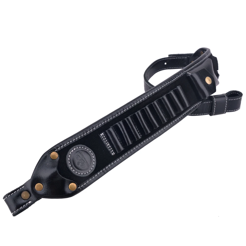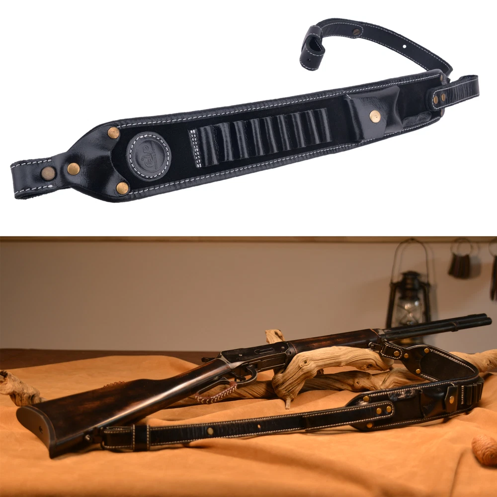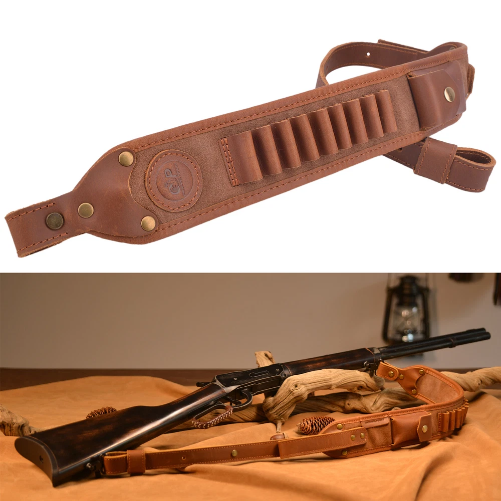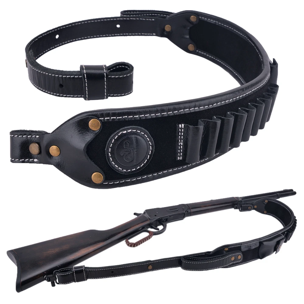 Made of high-quality first layer cow hide and suede leather makes you feel comfortable when carry. The Rifle Shoulder Strap has slots for 9pcs .270.308 .30-06, 22/250,.243, .20 7mm/08, 6.5 Creedmoor 410GA cartridges, come with a littlepocket to put your earplugsand also can hold the cloth for wiping the telescope. Magnetic buttons for easy opening and closing. High-quality hardware and heavy-duty stitching are durable. Both ends of the shoulder strap are 1 inch wide, suitable for most rifle swivels. The Hunting Shotgun Belt is equipped with leather handle. It will be an excellent hunting accessory for your rifle. Check our store to find more products. Adjustment end includes stitched leather keeper loops, adjustable from 33.5" to 41.5".