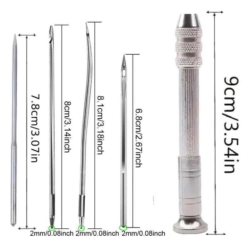 Specifications High-concerned chemical None Set Type Yes Type of Wholesale No Material Metals Origin Mainland China π§΅ Sewing Awl Kit β Leather Canvas Repair Tool Set (5pcs) π οΈ This metal sewing awl kit is a durable and practical hand tool, perfect for sewing, repairing, and crafting heavy materials like leather, canvas, and shoes. Ideal for DIY users, craftsmen, and professionals. π Key Features π© High-Quality Metal β Exquisite appearance, strong, and durable for long-term use. π Replaceable Needles β Assembled design allows needles to be easily changed as needed. πͺ‘ 4 Different Needles Included β Straight needle Bent needle Round hole needle No-hole needle π¦ Wide Application β Great for repairing leather, canvas, bags, shoes, soles , and more. π Easy to Use β Needle moves freely from the handle for convenient operation. π Specifications Product Name: Sewing Awl Kit Material: Metal Taper-Shank Size: 9 cm / 3.54 in Straight Needle Length: 8 cm / 3.14 in Bent Needle Length: 8.1 cm / 3.18 in Round Hole Needle Length: 6.8 cm / 2.67 in No-Hole Needle Length: 8 cm / 3.14 in π¦ Package Includes β 1 Γ Metal Handle β 1 Γ Straight Needle β 1 Γ Bent Needle β 1 Γ Round Hole Needle β 1 Γ No-Hole Needle β οΈ Safety Note β οΈ Needles are sharp. Please keep away from children . π§° A must-have hand tool for leatherwork, canvas repair, and DIY sewing projects!