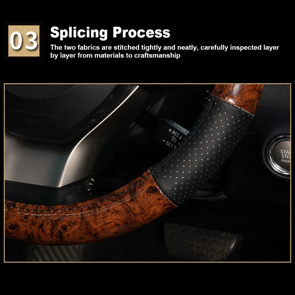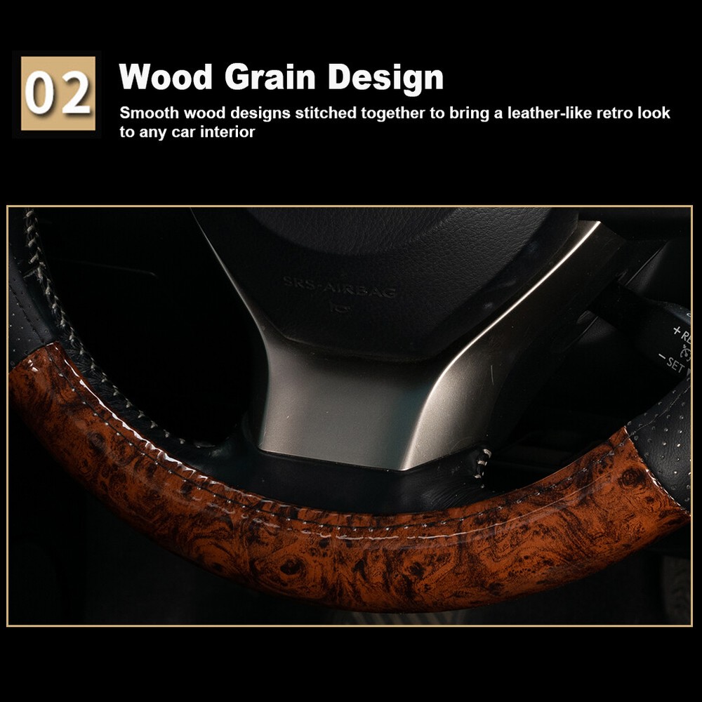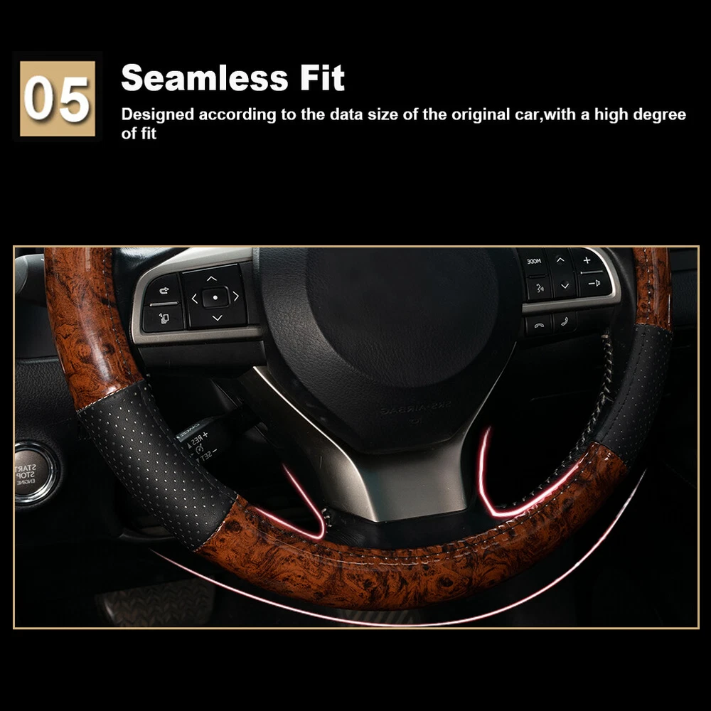 Features: --Anti-slip rubber inner ring & perforated leather. --Wood Grain Design. --More suitable for the original steering wheel. --Four Seasons Universal . --Feel comfortable, anti-skid and wear-resistant. --A perfect coat for your steering wheel . Specifications: Size: 38cm(15inch) Fitment: for Steering Wheels with an Outer Diameter of 37~38 cm(14.5" to 15") Color: Wood Grain Material: Wood Grain PVC & Faux Leather Package contents: 1 x Steering Wheel Cover