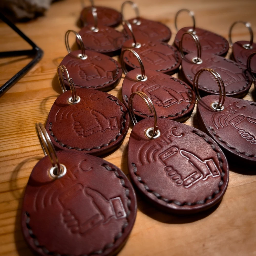 Natural leather, veg tanned,thick and strong skin (5 oz or 2mm thickness), keyring with NFC tag only included. Handmade. Shipping from Ukraine. You can write your telephone number, or GEO location, or BTC wallet number, Wi-Fi password, or social media link, or website. Just hold your phone above keyring, and it will be automaticly scanned.