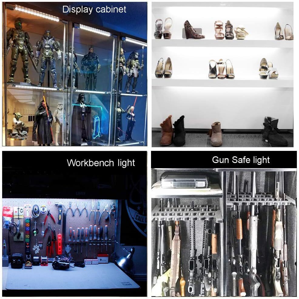Cool White (6000K) Cabinet Strip Light Bars : Per light bar costs only 1.2 Watt, delivers 100 lumen , which is 400 lumens and 4.8W in total for each kit. Advanced technology: safer, ultra bright, amazing performance.Long life-span and low light decay,Bulb Life 50000.00 Hours Energy Efficient: Saves more than 90% energy when compared with traditional halogen lamp Design Patented, UL,CE certified,1 year warranty With adhesive tape on the back and screws for easy installation,suitable for fitting to all types of under cabinet, book shelves and kitchen cupboards.