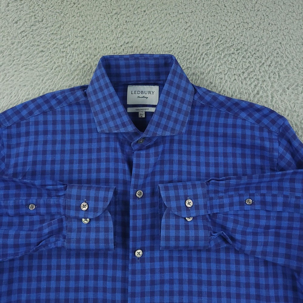 Ledbury Dress Shirt Mens 15.5 Blue Gingham Tailored Fit Cotton Linen Long Sleeve Brand: Ledbury Style: Mens long-sleeve dress shirt with spread collar and button front in a tailored slim fit silhouette. Color/Pattern: Blue gingham check with tonal shades of blue. Tag size: 15.5 Material: 55% cotton, 45% linen for lightweight, breathable comfort. Details: Front button placket, long sleeves with barrel cuffs and adjustable buttons, no chest pocket, back yoke, and curved shirttail hem. Made in Turkey Measurements are included in the photos, compare measurements with your item to ensure proper fit. Items are added daily click here to Visit My Store Combined shipping for US customers is 1.99 for each additional item Items are cleaned per eBay standards & policies