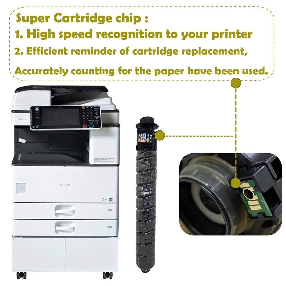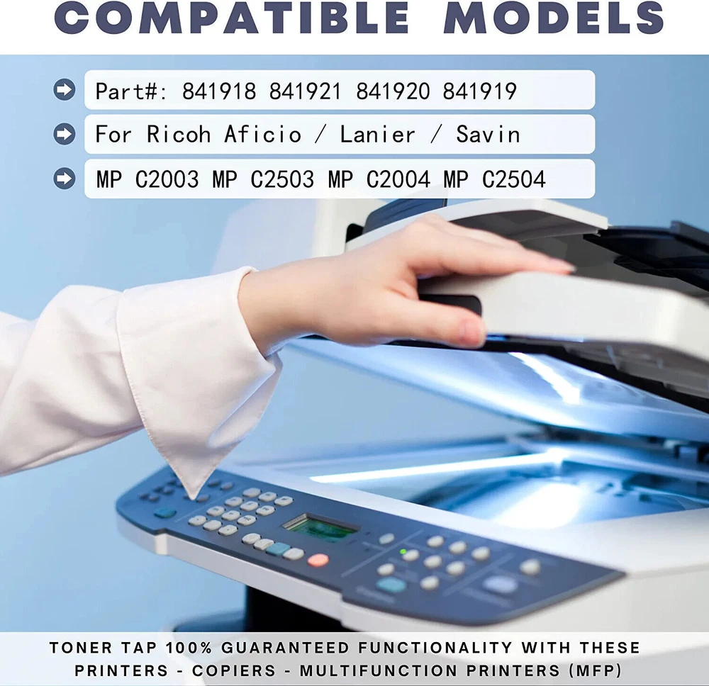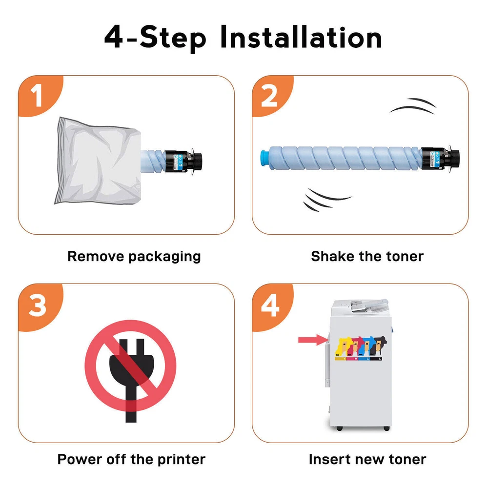 For use in Ricoh Aficio Lanier Savin MP C3003, MP C3503, MP C3004, MP C3504 Printers PREMIUM Toner kit contains 1 of each CMYK cartridge PAGE YIELD: 15,000 pages/black and 9,500 pages/color, based on the ISO/IEC 19798 industry standard of 5% page coverage BRIGHT Colors and BOLD Black prints. QUICK Shipping and Delivery. MODEL COLOR OEM# Yield @ 5% Aficio MP C3003,C3004,C3503,C3504 - Black 841918 15,000 Aficio MP C3003,C3004,C3503,C3504 - Cyan 841921 9,500 Aficio MP C3003,C3004,C3503,C3504 - Magenta 841920 9,500 Aficio MP C3003,C3004,C3503,C3504 - Yellow 841919 9,500 ✅ Toner supplies made with new components that match the strict OEM standards. Easy installation and error-free printing throughout the life cycle of the cartridge. ✅ 100% Factory Guarantee and Technical Support throughout the life cycle of the toner. Your satisfaction is our top priority because we believe in the quality of our products. 1. Open the front cover of the machine. 2. Pull out the toner cartridge slowly. 3. Take out the new toner cartridge from the box 4. Hold the toner cartridge and shake it five or six times. 5. Check the orientation of the toner cartridge and insert it carefully. 6. Close the front cover of the machine