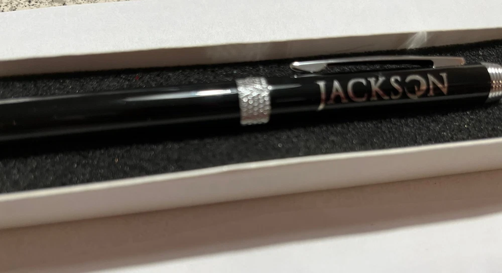 Leeds Ball Point Pen Glossy Black With Etched Chrome Trim JACKSON On Top Section of Pen. Twist to open and close. Very impressive looking! 5 5/8” Long x 3/8” Wide In Original Box