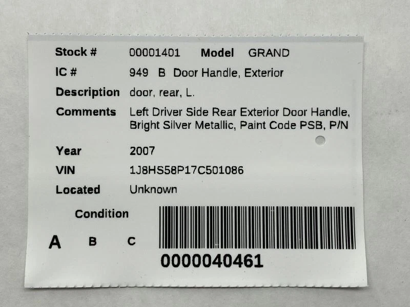 Hollander Welcome to our eBay store! Left Driver Rear Exterior Door Handle Fits 2005-2010 Jeep Grand Cherokee 82586 Description This listing is for a used Left Driver Side Rear Exterior Door Handle. The part pictured is the actual item you will receive, no other parts are included. The paint on this handle is scratched and worn off. Please see part fitment information and please match part numbers before buying this item. If you have any questions please let us know. Donor Vehicle Model : CHERGRAND Year : 2007 Mileage : 106000 (0 = not available or unknown) Stock Number : 001401 Notes : LEFT DRIVER SIDE REAR EXTERIOR DOOR 11425 This Part Will Fit These Makes And Models With These Options COMMANDER 06-10 rear, L., painted GRAND CHEROKEE 05-06 door, rear, L., painted GRAND CHEROKEE 07 door, rear, L. GRAND CHEROKEE 08-10 door, rear, L., painted About Us Payment Shipping Returns Warranty About Us Please contact us with any questions BEFORE purchasing. If you are unsure if this part will fit we are happy to verify fitment for you prior to purchase via your vehicle's VIN (Vehicle Identification Number). We try to answer all messages in 24 hours. Please note that orders are sent to the shipping department throughout the day therefore we cannot guarantee adjustments to orders after payment is received. Our hours of operation are: Monday - Friday 8:00AM - 5:00 PM CST Saturday - Sunday Closed Payment All orders must be paid in full prior to shipment. Payments are processed through eBay. We accept credit card and cash for Local Pickup orders. If payment is not received, an Unpaid Item case will be opened for the sake of seller fee reimbursement. Sales tax will be collected by eBay where applicable. Shipping We ship items via UPS, USPS, or LTL Freight Carriers. Tracking information is uploaded to the order once the item is shipped. Larger items such as Engines, Transmissions, Doors, Tailgates, Trunk Lids, Rear Axles etc. will ship via freight. Freight items are unable to be shipped until we have all the necessary information required by the carrier. Typically that includes a valid business name, address, valid phone number, and hours of operation. Be sure to provide us with all necessary contact information with your order as well. Freight charges are for zoned commercial addresses with a forklift or loading dock. If the location requires the assistance of a lift gate there will be an additonal fee. If a commercial address is not able to be provided we can ship the item to your residence for an additional fee. Add $100 for Residential delivery Add $85 for Liftgate delivery Most orders are shipped within one business day. If there is an issue with your order or item we will reach out to you before we ship the order. Once payment is received for a freight item we will send a message asking for additional information needed for the freight carrier. Without this information we will not be able to ship your item. If a USPS or UPS item is damaged during shipping please keep all packaging and loose parts complete with the package. Send us a message through Ebay with some pictures and your invoice number. We will work on getting a replacement item to you while handling the UPS claim as well. Please Inspect all freight shipments before signing for them at time of delivery! If there has been any damage to the item during shipping inspect the item to see if you can still use it or not. If you can still use the item, notate the damage on the delivery ticket that the driver is keeping then hand it back to them. Send us a message with a copy of your receipt and the delivery ticket you kept. We will take care of the damage claim with the freight carrier. If you cannot use the product simply decline the shipment send us a message and we will work on getting a replacement or refund to you. It is very important to not sign for any damaged product without notating it on the delivery ticket or denying the shipment. You have the right to inspect the package for obvious signs of damage prior to signing and accepting the delivery. If a delivery driver is refusing to let you inspect the shipment before you sign for it, do not sign, refuse the shipment and contact us through eBay messaging. When you sign for the delivery on the carrier's Bill Of Lading (BOL) it is accepting the merchandise as is and in good order. So please inspect your package before signing for it. We do understand that sometimes there will be damage that is missed, don’t worry we will still be able to help you. If you do find concealed damage after you sign for the package let us know through messages and send some pictures as well. We will get with the freight company and start a claim. We are not responsible for any delays incurred by the shipping company. No International shipping is available outside of the eBay Global Shipping program. We do not ship to PO Boxes, Hawaii, Alaska, Puerto Rico, APO, FPO, AA, AE, AP and U.S. Territories outside of the continental U.S. International orders are shipped via eBay’s Global Shipping Program. Customer pickup at our location is also available. Please contact us prior to your purchase to arrange pick up. Returns If you need to return an item for any reason please contact us first to obtain a RMA number (Return Material Authorization). All returns must be authorized by us before being shipped back. Any items returned must include an RMA number clearly written on the side of the packaging. If you are returning a part because you bought the wrong one or no longer need it the original shipping charges are not refunded and you are responsible for the return shipping. All returns must be made within 30 days of the date of purchase. All parts must be returned in their original condition to receive full credit Once you obtain an RMA number, ship the item back to: Frontier Auto Parts, 2199 Ranger Hwy, Weatherford, TX 76088 Warranty All parts we sell through eBay Motors come with a 30-day warranty and a 30 day return 
