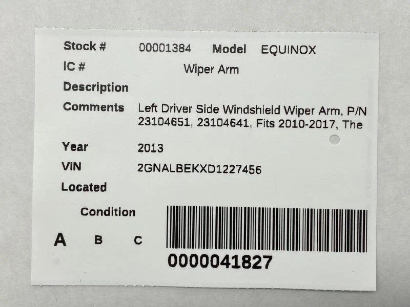 Hollander Welcome to our eBay store! Left Driver Side Windshield Wiper Arm Fits 2010-2017 Chevrolet Equinox 68026 Description This listing is for a used Left Driver Side Windshield Wiper Arm. The part pictured is the actual item you will receive, no other parts are included. This part is used so normal wear, such as scratches, scuffs or fading is to be expected. The paint on this wiper arm is faded and peeling. Please see part fitment information below and please match part numbers before buying this item. If you have any questions please let us know. Donor Vehicle Model : EQUINOX Year : 2013 Mileage : 108000 (0 = not available or unknown) Stock Number : 001384 Notes : LEFT DRIVER SIDE WINDSHIELD WIPER AR 021126 This Part Will Fit These Makes And Models With These Options About Us Payment Shipping Returns Warranty About Us Please contact us with any questions BEFORE purchasing. If you are unsure if this part will fit we are happy to verify fitment for you prior to purchase via your vehicle's VIN (Vehicle Identification Number). We try to answer all messages in 24 hours. Please note that orders are sent to the shipping department throughout the day therefore we cannot guarantee adjustments to orders after payment is received. Our hours of operation are: Monday - Friday 8:00AM - 5:00 PM CST Saturday - Sunday Closed Payment All orders must be paid in full prior to shipment. Payments are processed through eBay. We accept credit card and cash for Local Pickup orders. If payment is not received, an Unpaid Item case will be opened for the sake of seller fee reimbursement. Sales tax will be collected by eBay where applicable. Shipping We ship items via UPS, USPS, or LTL Freight Carriers. Tracking information is uploaded to the order once the item is shipped. Larger items such as Engines, Transmissions, Doors, Tailgates, Trunk Lids, Rear Axles etc. will ship via freight. Freight items are unable to be shipped until we have all the necessary information required by the carrier. Typically that includes a valid business name, address, valid phone number, and hours of operation. Be sure to provide us with all necessary contact information with your order as well. Freight charges are for zoned commercial addresses with a forklift or loading dock. If the location requires the assistance of a lift gate there will be an additonal fee. If a commercial address is not able to be provided we can ship the item to your residence for an additional fee. Add $100 for Residential delivery Add $85 for Liftgate delivery Most orders are shipped within one business day. If there is an issue with your order or item we will reach out to you before we ship the order. Once payment is received for a freight item we will send a message asking for additional information needed for the freight carrier. Without this information we will not be able to ship your item. If a USPS or UPS item is damaged during shipping please keep all packaging and loose parts complete with the package. Send us a message through Ebay with some pictures and your invoice number. We will work on getting a replacement item to you while handling the UPS claim as well. Please Inspect all freight shipments before signing for them at time of delivery! If there has been any damage to the item during shipping inspect the item to see if you can still use it or not. If you can still use the item, notate the damage on the delivery ticket that the driver is keeping then hand it back to them. Send us a message with a copy of your receipt and the delivery ticket you kept. We will take care of the damage claim with the freight carrier. If you cannot use the product simply decline the shipment send us a message and we will work on getting a replacement or refund to you. It is very important to not sign for any damaged product without notating it on the delivery ticket or denying the shipment. You have the right to inspect the package for obvious signs of damage prior to signing and accepting the delivery. If a delivery driver is refusing to let you inspect the shipment before you sign for it, do not sign, refuse the shipment and contact us through eBay messaging. When you sign for the delivery on the carrier's Bill Of Lading (BOL) it is accepting the merchandise as is and in good order. So please inspect your package before signing for it. We do understand that sometimes there will be damage that is missed, don’t worry we will still be able to help you. If you do find concealed damage after you sign for the package let us know through messages and send some pictures as well. We will get with the freight company and start a claim. We are not responsible for any delays incurred by the shipping company. No International shipping is available outside of the eBay Global Shipping program. We do not ship to PO Boxes, Hawaii, Alaska, Puerto Rico, APO, FPO, AA, AE, AP and U.S. Territories outside of the continental U.S. International orders are shipped via eBay’s Global Shipping Program. Customer pickup at our location is also available. Please contact us prior to your purchase to arrange pick up. Returns If you need to return an item for any reason please contact us first to obtain a RMA number (Return Material Authorization). All returns must be authorized by us before being shipped back. Any items returned must include an RMA number clearly written on the side of the packaging. If you are returning a part because you bought the wrong one or no longer need it the original shipping charges are not refunded and you are responsible for the return shipping. All returns must be made within 30 days of the date of purchase. All parts must be returned in their original condition to receive full credit Once you obtain an RMA number, ship the item back to: Frontier Auto Parts, 2199 Ranger Hwy, Weatherford, TX 76088 Warranty All parts we sell through eBay Motors come with a 30-day warranty and a 30 day return period unless otherwise stated. No labor warranty is provided. In the e
