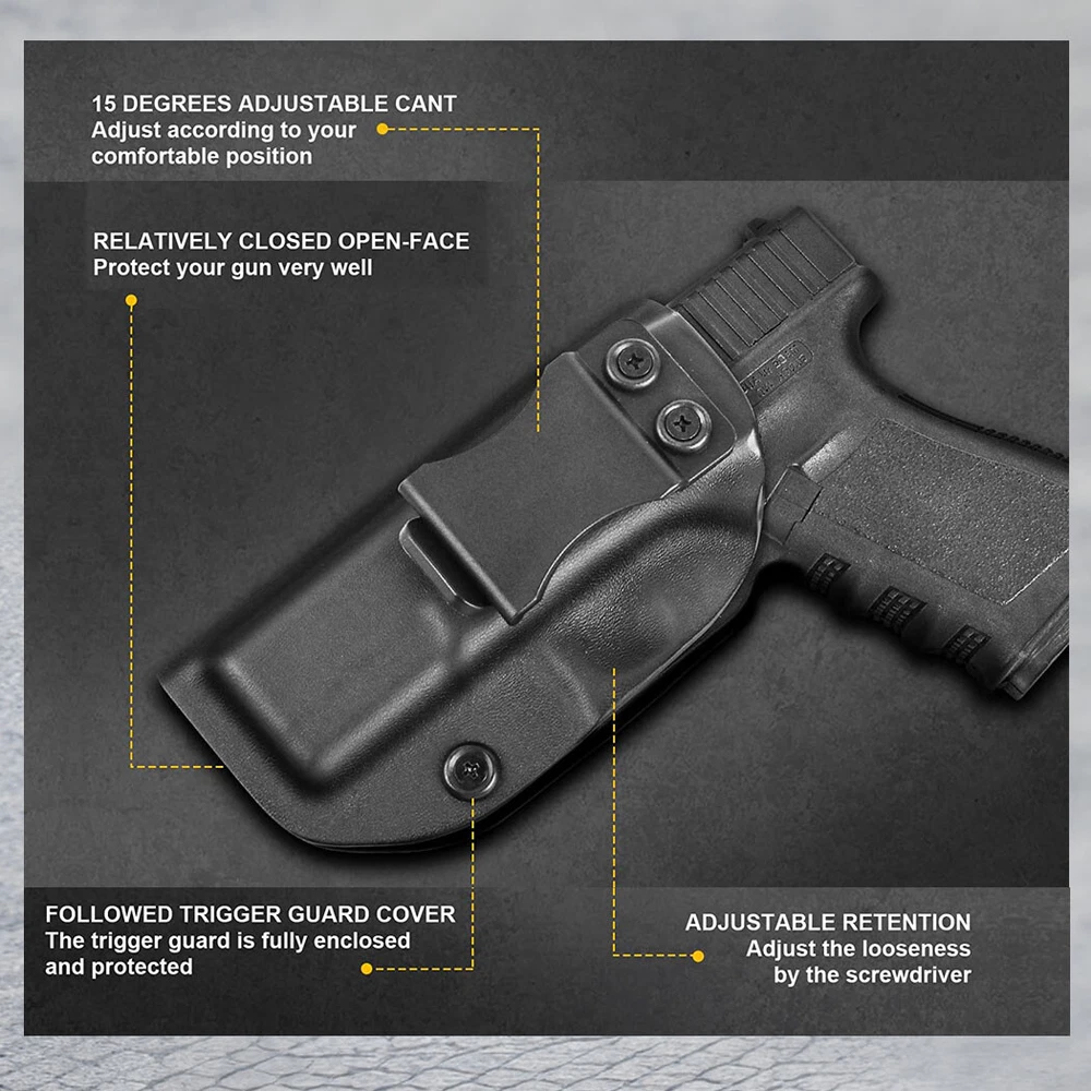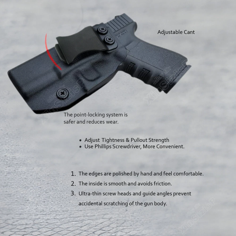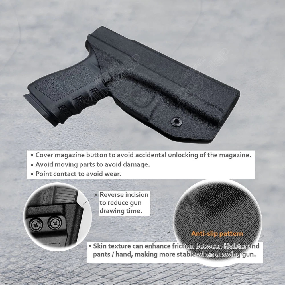 High Quality Military & Police Grade Polymer IWB Holster Specially Designed For Fast Draw During Duty Or Shooting Competition. Left Hand Draw Inside Waistband Holster Holster fit Glock 19 Gen1-4 9mm Luger Glock 19X 9mm Luger Glock 19C Gen3 9mm Luger Glock 19 Gen3 RTF2 9mm Luger Glock 19M 9mm Luger Glock 19 TFX 9mm Luger Glock 19 BB 9mm Luger Glock 23 Gen2-4 .40 S&W Glock 32 Gen3-4 .357 SIG Glock 44 .22 LR Materials & Durable Made of durable high-tech Kydex materials - Stronger than leather will wear out, the Kydex holster will not wear out and get flimsy. CARRY WITH CONFIDENCE: Please feel free to use our portable concealed holster to protect for Glock 19 Holster. This is our high-quality KYDEX IWB Holster tailored for Glock 19 19X 25 44 45 (Gen 1-5) & Glock 23 32 (Gen 3-4) Holster. It is not only highly precise, but also rugged and durable, and can be hidden and portable, so you can protect yourself anytime, anywhere. Concealed Carry inside the waistline carry The combat-proven Holster by Tactical Scorpion Gear is a step forward in holster design and technology. COMPATIBILITY: The holster will fit any standard size 1.5 inch belt or lower. It WILL NOT fit Glocks with any aftermarket attachments (i.e. laser, flashlight, etc) however aftermarket sights are ok. Ease And Comfort Easy on / Easy off - No need to undo your belt every time you wear your holster.Sweat-proof- Protect your weapon from salty perspiration and not absorb sweat.Adapt to every environment In the Package: · 1*Holster Shipping: Ships same day or next except Sundays and Holidays ! Free shipping! Ship by USPS First Class Package. 100% MONEY BACK GUARANTEE. Any question please be free to contact with us .Thanks!
