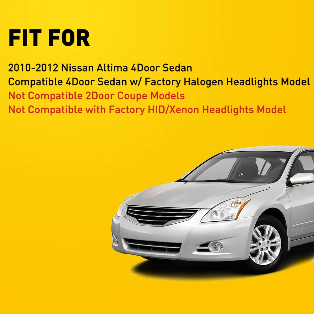 Fit for: 2010-2012 Nissan Altima 4Door Sedan Compatible 4Door Sedan w/ Factory Halogen Headlights Model Not Compatible 2Door Coupe Models Not Compatible with Factory HID/Xenon Headlights Model Specifications: OE number: 26010ZX00A, 26060ZX00A NI2503190, NI2502190 Material: ABS+PC (ABS Plastic Housing/Polycarbonate lens) Appearance color: 1.Housing Color: Chrome 2.Lens Color:Clear 3.Reflector Color:Amber Note: Projector ×(Not include) DRL × (Not include) Bulb × (Not include) Left Right Pair Headlight Assembly Halogen For 2010-2012 Nissan Altima NI2503190 Fit for: 2010-2012 Nissan Altima 4Door Sedan Compatible 4Door Sedan w/ Factory Halogen Headlights Model Not Compatible 2Door Coupe Models Not Compatible with Factory HID/Xenon Headlights Model Specifications: OE number: 26010ZX00A, 26060ZX00A NI2503190, NI2502190 Material: ABS+PC (ABS Plastic Housing/Polycarbonate lens) Appearance color: 1.Housing Color: Chrome 2.Lens Color:Clear 3.Reflector Color:Amber Note: Projector ×(Not include) DRL × (Not include) Bulb × (Not include) Features: *Easy to install: Direct replacement, drilling and cutting are not required. *Superior quality: Made of ABS and PC materials with toughness and heat resistance functions to ensure its long service life and durability. *Angle adjustment: Equipped with a headlamp Angle adjustment knob, you can adjust the best Angle of view through the knob. *Suggestion: 1.Please confirm the OE number before purchasing!!! 2.Professional installation is required!!! Packaging include: Headlights*2(Left+Right) Item Specifics Brand AUXITO Lighting Technology Halogen Type Headlight Assembly Features Reflector Housing, SAE-Certified, Sealed Assembly Housing Color Chrome Placement on Vehicle Front Left,Right Light Color No Bulb Lens Color Clear Reflector Color Amber Manufacturer Part Number NSAT10.00 Color Temperature \ Voltage 12 V Mounting Style Screws Vintage Part Yes Performance Part Yes Manufacturer Warranty 5 Years Universal Fitment No Number of Bulbs 0 Finish Smooth Model For 2010-2012 Nissan Altima 4Door Sedan OE/OEM Part Number 26010ZX00A, 26060ZX00A,NI2503190, NI2502190 Quantity 2 Headlight assembly Packaging include Left & Right Side Headlights Assembly Bulbs Included Not Included Bulb Shape Code Please Use Stock Bulbs Include Projector Not Included Include DRL Not Included Fitment Type Direct Replacement Assembly Type Composite Type Headlight Assembly Mounting Hardware Included No Certifications DOT, SAE Dust and Moisture Protection Yes Waterproof Yes Ballast Included No Applicable Regions US Items Included Headlight Assembly Bulb Shape Code Just like the original Wattage \ Payment Variety of payment methods are accepted, such as credit, debit, gift cards, Apply pay, Google Pay, Paypal and Paypal Credit. Shipping 1. All items will be shipped in 24 hours after receiving your payment . 2. We ship this item to US only via USPS first class mail. It usually takes 3-5 working days to deliver. Returns 1. We offer 60 days return policy. 2. Please contact us if you have any questions with the products . 3. Refund will be sent after we got your returned package. 4. All returned items should be in the original packaging with tracking number. Contact Us We work from Monday - Saturday 9:00AM - 6:00PM, but we will reply once we get your message. There will be delay on response if you send message or E-Mail on Sunday. DESCRIPTION PAYMENT SHIPPING RETURN POLICY CONTACT US Shop Category Store Home LED Headlight ◈ 9005 HB3 ◈ 9006 HB4 ◈ H7 LED Fog Light ◈ H8 H9 H11 LED Plate Light LED Reverse Light LED Brake Light Rear Bumper Light LED Tail Light Tail Light assemblies Car Parts & Accessories ◈ LED Third Brake Light ◈ Other Parts & Accessories Other New List Item Motorcycle Wind Swivel Stealth Rear Wing View Mirror Side Fit Honda ABS plastic USD 29.09 New LED Dually Bed Fender Side Marker Lights Amber/Red For 99-10 Ford F350 F450 USD 13.99 5202 H16 LED Fog Light Bulbs 6500K White 80W for 2007-2015 Chevy Silverado 1500 USD 28.99 For Dodge Ram 1500 2500 3500 Heated Driver Left Side Upper Towing Mirror Glass I USD 24.99 9006 9005 LED Headlight KIT Combo Bulbs 6500K High Low Beam Super Bright White USD 47.99 Hot Item Rubber Seal Trim Prevent Water Leakage Windshield Sunroof Roof Top Window 10FT USD 10.99 Rubber Seal Trim Prevent Water Leakage Windshield Sunroof Roof Top Window 10FT USD 12.99 Auxito 9005 + H11 Combo LED Headlight 120W 80000LM High/Low Beam 6500K Bulbs Kit USD 46.99 FOR 94-04 MUSTANG PASSENGER or DRIVER SIDE MASTER POWER WINDOW CONTROL SWITCH USD 9.99 AUXITO Combo 4 9005 + H11 LED Headlight Kit Bulbs High Low Beam White 80000LM USD 35.99 Similar Item Excellent Delivery Left Right Pair Headlight Assembly Halogen For 2010-2012 Nissan Altima NI2503190 Fit for: 2010-2012 Nissan Altima 4Door Sedan Compatible 4Door Sedan w/ Factory Halogen Headlights Model Not Compatible 2Door Coupe Models Not Compatible with Factory HID/Xenon Headlights Model Specifications: OE number: 26010ZX00A, 26060ZX00A NI2503190, NI2502190 Material: ABS+PC (ABS Plastic Housing/Polycarbonate lens) Appearance color: 1.Housing Color: Chrome 2.Lens Color:Clear 3.Reflector Color:Amber Note: Projector ×(Not include) DRL × (Not include) Bulb × (Not include) Features: *Easy to install: Direct replacement, drilling and cutting are not required. *Superior quality: Made of ABS and PC materials with toughness and heat resistance functions to ensure its long service life and durability. *Angle adjustment: Equipped with a headlamp Angle adjustment knob, you can adjust the best Angle of view through the knob. *Suggestion: 1.Please confirm the OE number before purchasing!!! 2.Professional installation is required!!! Packaging include: Headlights*2(Left+Right) Item Specifics Brand AUXITO Lighting Technology Halogen Type Headlight Assembly Features Reflector Housing, SAE-Certified, Sealed Assembly Housing Color Chrome Placement on Vehicle Front Left,Right Light Color No Bulb Lens Color Clear Reflector Color Ambe