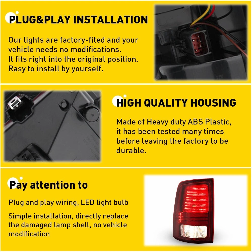 Fits For: For 2019-2022 Dodge Ram 1500 Specifications: OE:55112991AC, 55112991AD, 55112991AB Waterproof grade: IP67 Light type: LED Housing color: Red Placement on vehicle: Left Features: *Easy to install: Direct replacement, drilling and cutting are not required. *Superior quality: Superior material with toughness and heat resistance functions. *Plug and play, the LED bulb is included in the package. *No blind spots *Note: 1.Please confirm the OE number before purchasing!!! 2.Professional installation is required!!! Left Side Tail Lights For 2013 2014-2018 RAM 1500 2500 3500 LED Rear Brake Lamp Fits For: For 2019-2022 Dodge Ram 1500 Specifications: OE: 55112991AC, 55112991AD, 55112991AB Waterproof grade: IP67 Light type: LED Housing color: Red Placement on vehicle: Left Features: *Easy to install: Direct replacement, drilling and cutting are not required. *Superior quality: Superior material with toughness and heat resistance functions. *Plug and play, the LED bulb is included in the package. *No blind spots *Note: 1.Please confirm the OE number before purchasing!!! 2.Professional installation is required!!! Packaging include: Tail Light*1 ABOUT US Left Side Tail Lights For 2013 2014-2018 RAM 1500 2500 3500 LED Rear Brake Lamp Fits For: For 2019-2022 Dodge Ram 1500 Specifications: OE: 55112991AC, 55112991AD, 55112991AB Waterproof grade: IP67 Light type: LED Housing color: Red Placement on vehicle: Left Features: *Easy to install: Direct replacement, drilling and cutting are not required. *Superior quality: Superior material with toughness and heat resistance functions. *Plug and play, the LED bulb is included in the package. *No blind spots *Note: 1.Please confirm the OE number before purchasing!!! 2.Professional installation is required!!! Packaging include: Tail Light*1 FAQ Shipping Returns Contact Us Payment Why swith to LED? LEDs not only give your vehicle a clean, modern look but, with proper use, will outlast any halogen bulb and HID bulb! Low energy draw, high lumen output, and instant on/off LED technology out shines stock bulbs in every way. Which bulbs are used in my vehicle? Check Sylvania automotive lamp replacemnt guide , you can select the year, make, and model of your vehicle, then select the application you want to replace or upgrade from stock. What does CAN Bus mean? CAN Bus means Controller Area Network Bus. This system monitors your vehicle and reports operating conditions. CAN Bus systems are commonly found in European vehicles such as BMW, Audi, Mercedes, Volkswagen, Porsche, and in many American vehicles. While most late model American vehicles have CAN Bus systems, it is always good to check with your vehicle dealer to see which system your vehicle has before purchasing electrical products. When do you need Warning Canceller? Some vehicles with cmplex internal computers(such as Audi,BMW,Jaguar,Mercedes,etc.) might report on-dash errors or flickering on the headlights. The warning canceller fixes the dashboard warning and flickering effect. Bulb Out Dashboard Error: On some vehicles, the dashboard will report as if you have a headlight bulb missing or burnt. It does not affect the headlights functioning, but the light on-dash will be on. The warning canceller fixes the issue. Flickering Issue: This happens when your vehicle does not recognize the new headlights installed. When turning the headlights on, the vehicle's computer does not understand the signal back from the headlights hence thinking they are still off. This triggers the headlight flickering effect. The warning canceller solves this issue. LED Advantages: Very low and efficient energy consumption than halogen bulbs & HID Bulbs Compared with HID bulbs, LED bulbs Light up instantly, no warm up period Low voltage protection, high precision constant current driver chip Longer lifespan than HID and halogen bulbs Light can be controlled easily in color and intensity Easy to install a LED headlight conversion kit (1) We will ship your item(s) within 24 hours. (2) We ship this item to US only via USPS first class mail. It usually takes 3-6 working days to deliver. How Long Will It Take to Receive My Refund? If you have emailed us for a refund ,once we have approved it ,after 60 days your money will be refunded. The estimated time for the refund to appear in your account is based on the payment method you use. Paypal is the only supported in NIGHTEYE Store. Please notify us within 30 days after you've received your purchased item. All return requests must be submitted through your eBay account. NOTE: Buyers pay for the return shipping fee. Items to be returned must be in resalable condition, for example: You do not satisfy the item quality Item do not fit your vehicle perfect Item can not reach your expectation The item arrived be broken You do not receive the item Parcel Lost Receive the wrong item If you have problems with the above issue, please Contact Us immediately ! [Our office hours are MONDAY - Saturday 9:00PM - 6:00PM PST, but we will response you once we get your message .There will be some delay on respons if you send message or E-Mail on Sundy.] (1).Negative feedback will not help resolve any problems you have, please contact us via eBay messages before leaving negative feedback, our customer service will make best effort to help you with the issues. (2).We maintain high standards of excellenceand strive for 100% customer satisfaction! Feedback is very important to us. We request that you contact us immediately BEFORE you give us neutral or negative feedback, so that we can satisfactorily address your concerns. (1).We only accept PayPal payment, should be received within 3 days from the date of purchase. (2).Please keep the consistency of Paypal address and ebay address. (3).Payment should be made within 4 days once you won a item ,or ebay will launch Unpaid Reminder agaist you and there will be bad record on your ebay account . On Nov 16, 2024 at 06:06:02 PST, seller added the following informatio
