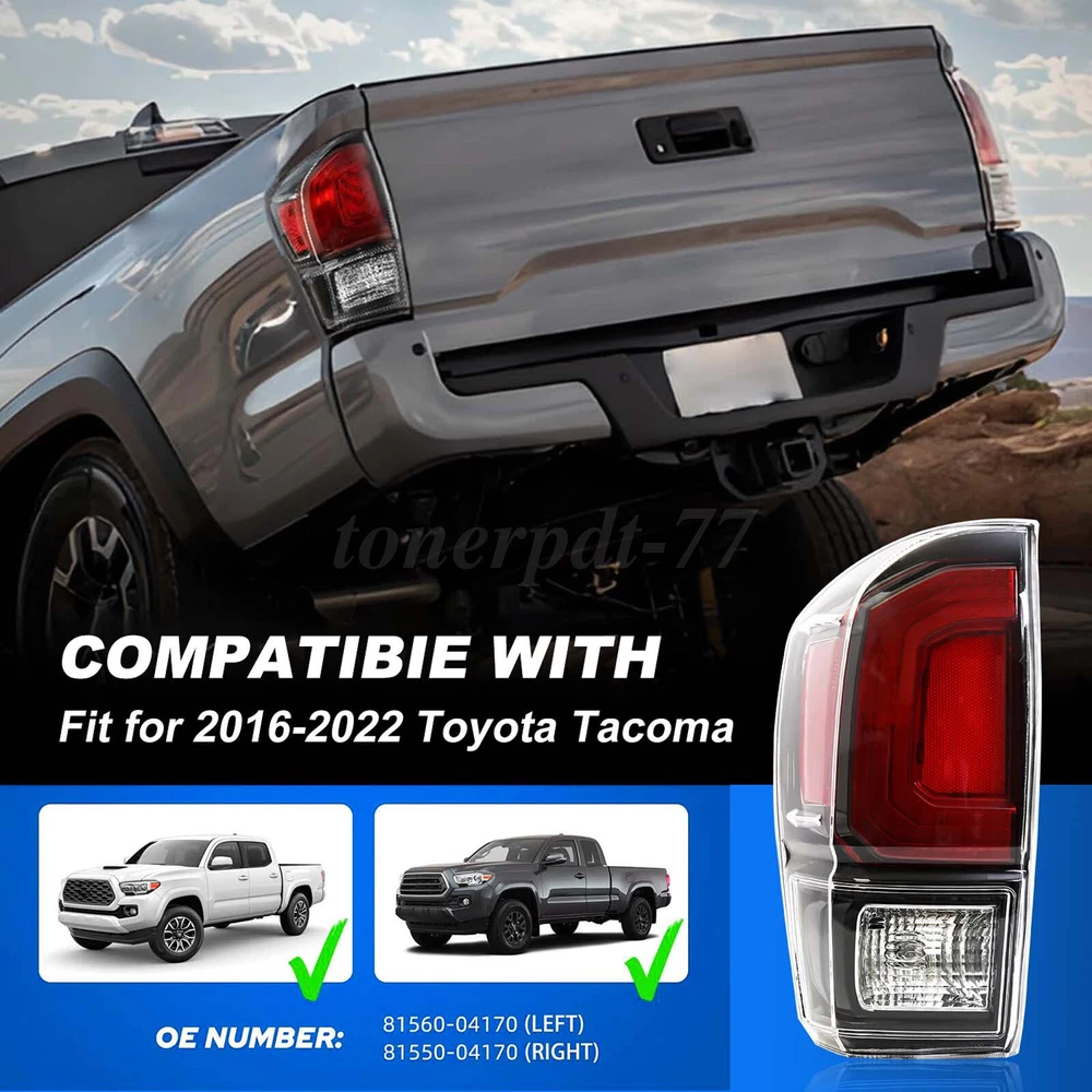 Need Assistance? Send Message Store Home New Arrivals Ending Soon Feedback About Us Store Home New Arrivals Ending Soon Feedback About Us FAST SHIPPING Safe & Secure SECURE PAYMENTS PAYPAL VERIFIED VAT REGISTERED Invoice Available EXPERT ADVICE Always here to assist Shop Categories Consumer Electronics Home & Garden eBay Motors Business & Industrial Sporting Goods SIMILAR ITEM Click it, and you will find the similar item in our store, always will have a good one for you. Similar Item Fast & Safe Left Tail Light Brake Lamp For 2016-2021 2022 2023 Toyota Tacoma TRD Driver Side Description: Our tail Lights will be your loyal partner when you drive your car through rugged mountain roads or storms. Our taillight products adopt advanced waterproof, shockproof and dustproof technologies, and adopt high-transmittance acrylic lenses to ensure that they are still stable and durable in bad weather and road conditions. Choosing our taillights will add elements of safety, comfort and fashion to your driving experience. Specification: Type: Tail Light Assembly Light Type: Halogen Bulb: Included Harness and Bulbs Housing Color: Chrome & Black Lens color: Clear Material: ABS Housing, PMMA Lens Waterproof: IP 65 How to Use: Replace Drectly Dust and Moisture Resistant: Yes Mounting Position: Rear Left Driver's Side OE/OEM Part Number: 8155004170 (Left) Interchange Part Number:TO2801197 (Left) Features: 【High light transmittance】Our taillight products use high light transmittance acrylic lenses to ensure that your vehicle can be noticed by other drivers in an instant under any light conditions. 【Ventilation design】In order to avoid the influence of rain, fog or wet weather on the lens, we specially designed vents to effectively prevent water vapor from condensing on the lens surface and keep the lens clear and bright, so that you can always keep a clear observation of the road behind. 【Easy to install】Plug and play operation. Bolt OE directly to install or replace the inventory unit, and the damaged taillight assembly can be quickly replaced without drilling and vehicle modification. 【Durable structure】The high-quality plastic structure is not easy to wear, which makes the lens have better wear resistance, reflectivity, aging resistance and aesthetics. Ensure the maximum performance and long service life of taillights. 【Waterproof】Intelligent waterproof sealing system effectively isolates water vapor and moisture, so that you don't have to worry about rain infiltration affecting the normal operation of lamps. 【Shockproof】The reinforced shockproof design ensures that the lamps are still stable and reliable when driving on bumpy roads and maintain a long service life. 【Appearance upgrade】The appearance of our car lights has been upgraded to show more exquisite and fashionable appearance features, which will make your vehicle glow with brand-new charm. Fitment: Fit for 2016-2023 Toyota Tacoma Package Contents: 1 PC Tail Light (Rear Left Driver's Side). Included Bulbs and Without Installation Instructions. Note: 1. Please confirm if the tail lights are suitable for your vehicle before purchasing. 2. The lights do not include installation instructions, professional installation is highly recommended if installation is difficult. 3. Before driving, please check whether the lights are installed firmly to ensure driving safety. 4. Due to differences in display and lighting, the picture may be slightly different from the actual product. 5. If you have any questions about the product, please contact us. Returns What Happens If I Have A Problem? We offer a wide range of high quality products at great value. We know sometimes things would go wrong but we aim to put them right as quickly and efficiently as possible. If you have a faulty or damaged item(s) or for any reason receive what appears to be incorrect goods, please take the photo for packaging box and item(with MPN code), then contact us and explain your problem. We will respond within 1 working day. Provided the product is within its warranty period, we will arrange, at our expense, the return of the product and send replacement goods within 1 working day. Please do not return goods until you have heard back from us. Unauthorised returns will be refused. Can I Change My Mind? Yes! If you need to return goods for any other reason, you must notify us within 7 days of receipt of your order. Refunds can only be made if the item is returned in the condition it was received including all documentation and original unopened packaging. Your return package must contain your eBay user ID/order number. Postage is the responsibility of the buyer. Damaged Items & Discrepancies? Any shortages or damage to your delivery must be advised to Charmular Motor within 24 hours of receipt. Provided that this notice is given, we will collect, replace, or refund the item free of charge. Any delivery discrepancy must be notified to us within 24 hours of receipt of goods. Goods delivered damaged should be signed for accordingly and Charmular Motor notified in writing within 24 hours. Please retain all damaged goods and packaging. Delivery Our standard estimated delivery timescale is between 1-5 working days. We dispatch orders daily Monday to Friday, and we aim to dispatch ALL orders within 1 working day of receiving cleared payment. During peak periods our dispatch lead times may vary. We do not offer a guaranteed delivery date with our standard FREE shipping option. If you require a guaranteed delivery date, please select the appropriate shipping option at checkout. Payment Our highly recommended and only acceptable way of payment is PayPal. We will only ship your items to your verified eBay or PayPal address. Please make sure your eBay and PayPal address is correct and up to date before you pay. About Us Charmular Motor is a rising business based in the heart of California. We specialise to selling compatible Auto part and other product at very competitive