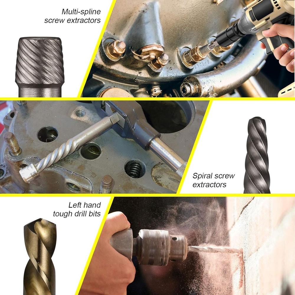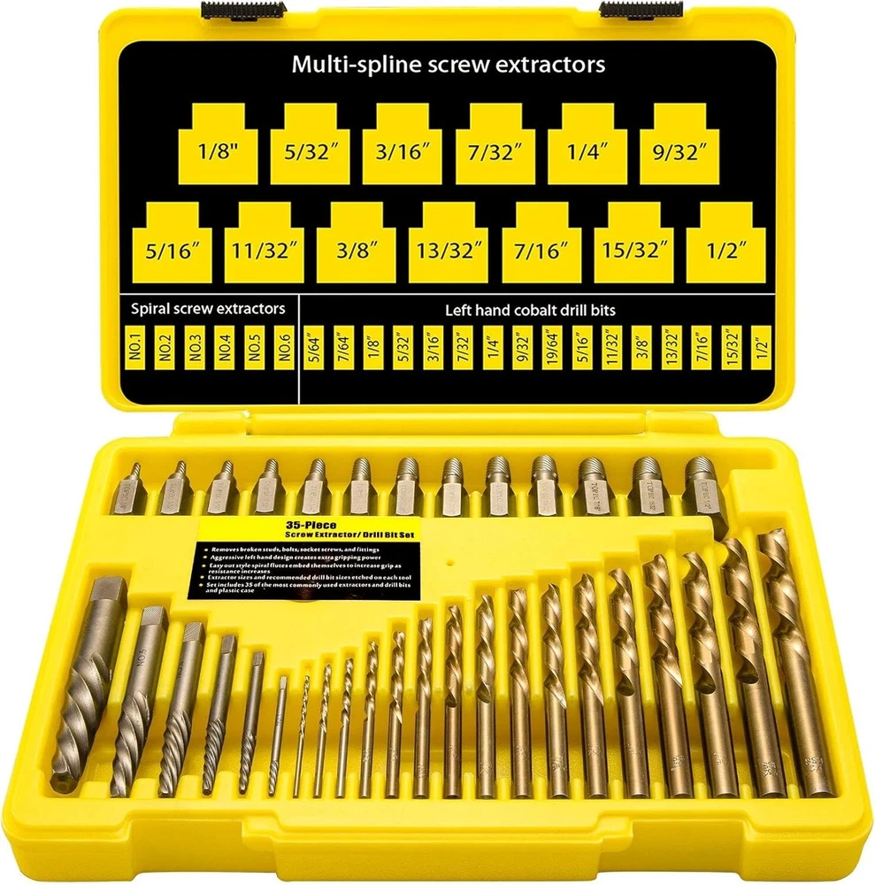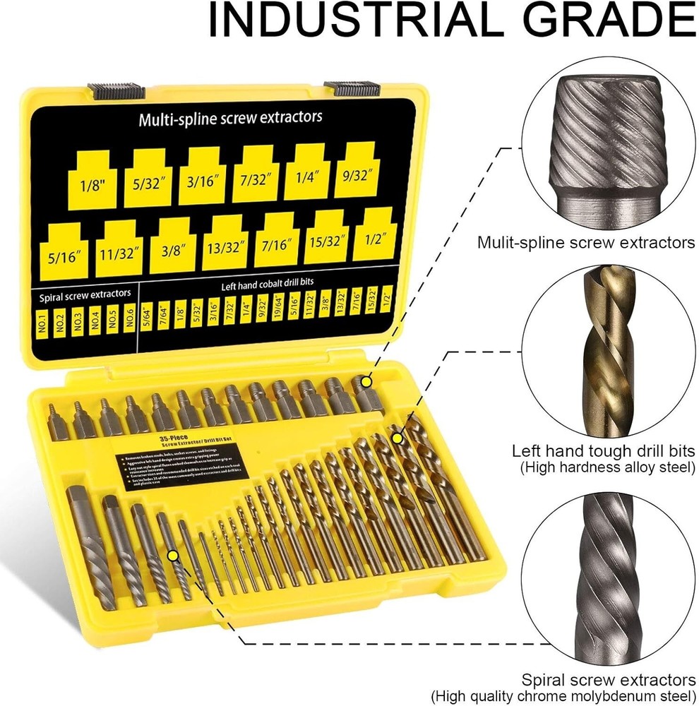 Juego De Extractor De Tornillos, Pernos Y Juego De Brocas Para Taladro Izquierda JUEGO MULTIFUNCIONAL DE 35 PIEZAS: 13 extractores de tornillos multiestriados, 16 brocas de cobalto para zurdos y 6 extractores de tornillos en espiral. DIVERSAS ESPECIFICACIONES Y TAMAÑOS: El juego contiene cuatro tipos de 35 modelos de piezas, incluyendo tamaños imperiales como: 1/8", 5/16", 5/8", 7/16", 11/32", 1/4", etc. Puede elegir el tamaño adecuado según el tamaño de sus sujetadores para satisfacer diversas necesidades de trabajo. ACERO CR-MO Y MATERIAL HSS: El juego está fabricado con acero CR-MO y materiales HSS. El diseño en espiral proporciona suficiente fuerza de agarre para facilitar la extracción. Se pueden utilizar materiales de alta calidad para sujetadores de diversos metales. Nota: Las brocas de cobalto no deben utilizarse para acero inoxidable. AMPLIA GAMA DE APLICACIONES: Los extractores de ranuras espirales son perfectos para sujetadores comunes. Los extractores multiestriados son útiles para herramientas de mayor torque y perfil bajo, mientras que los extractores de pernos permiten liberar sujetadores parcialmente expuestos. El kit también incluye una broca izquierda de cobalto para sujetadores, que permite perforarlos.