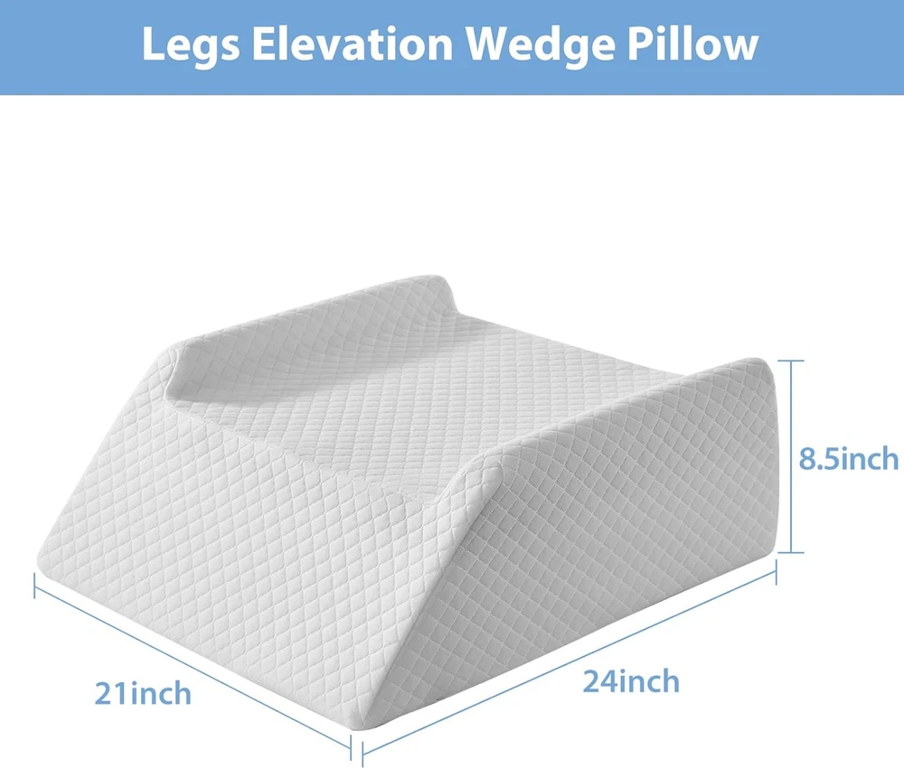 Leg Elevation Pillow for Blood Circulation after Surgery Swelling, Wedge Pillow for Legs Pain Relief, Foot & Ankle Injury, Rest & Sleeping, 8" Memory Foam Leg Pillow Soft but supportive leg elevation pillow : The top layer of the leg pillow is made of gel memory foam for softness and comfort. The bottom layer of the leg elevating pillow is made of high-density foam, which foot pillow provides effective support without deformation over time. Reduce swelling and quick recovery leg wedge pillow: leg pillow Elevating the legs above heart level promotes optimal blood circulation, leg elevation pillow reducing swelling and expediting recovery by up to 30%. This leg pillow elevation blood circulation is an perfect choice for pregnant women, the elderly and individuals recovering from knee, hip, or femur surgeries, as well as those managing leg injuries. Ease discomfort leg elevation pillows for after surgery: Backaches, knee soreness, and varicose veins frequently disrupt your sleep. Our knee surgery pillow offers relief by raising your legs, alleviating pain for a more comfortable and restful sleep. foot pillows for elevation while sleeping prepare you for a comfortable night's sleep! Made for maximum comfort leg elevating pillow: our knee pillow post surgery are precisely angled at 45º to optimize leg height for maximum fit and comfort. The bottom non-slip fabric of leg elevation pillow and U-shaped grooves of the leg wedges for elevation for swelling ensure that your legs stay firmly planted on the foot elevation pillow throughout the night, preventing any unwanted sliding and allowing you to sleep soundly throughout the night. leg elevation pillows for after surgery: All of us have suffered from back pain, leg, knee, ankle injuries, and surgery. The wedge pillow for knee pain is a unique item for those recovering from surgery to help ease their pain and give them the care they need most! In addition, the leg pillow for back pain can be used for daily living such as sleeping, reading, relaxing, and working to bring comfort to life. Product Description Legs don't Slip anymore ! The U-shaped grooves prevent your legs from preventing any unwanted sliding, allowing you to sleep soundly throughout the night. Soft & Breathable Fabric Choose luxury bamboo fiber fabric, breathable, comfortable, even in the hot summer will not swe. Non-slip Bottom The bottom is made of non-slip fabric, so you won't slide while you sleep. Easy to Clean Comes with a deluxe removable pillowcase that is easy to remove and wash for a comfortable night's sleep every time. 1 Sleeping 2 Reading 3 Relaxing 21.0 "w x 24.0 "w. Weight: 4.02 lb Item model number HUTXZBS2421 Unit Count 1.0 Count Color White Pattern Solid Product Dimensions 24"L x 21"W Material Memory Foam Use for Ankle, Knee, Back, Body, Feet Item Weight 4.02 pounds Shape Wedge Fill Material Memory Foam Maximum Tilt Angle 45 Degrees Age Range (Description) All age Recommended Uses For Product Reading, Nursing, Sleeping, Resting, Recovery Size 24*21*8.5 Inch Special Feature Machine Washable Cover, Ergonomic Support, Skin-Friendly, Removable Cover, Breathable Item Firmness Description Medium Soft Product Care Instructions Machine Wash Number of Pieces 1