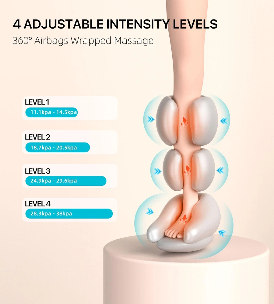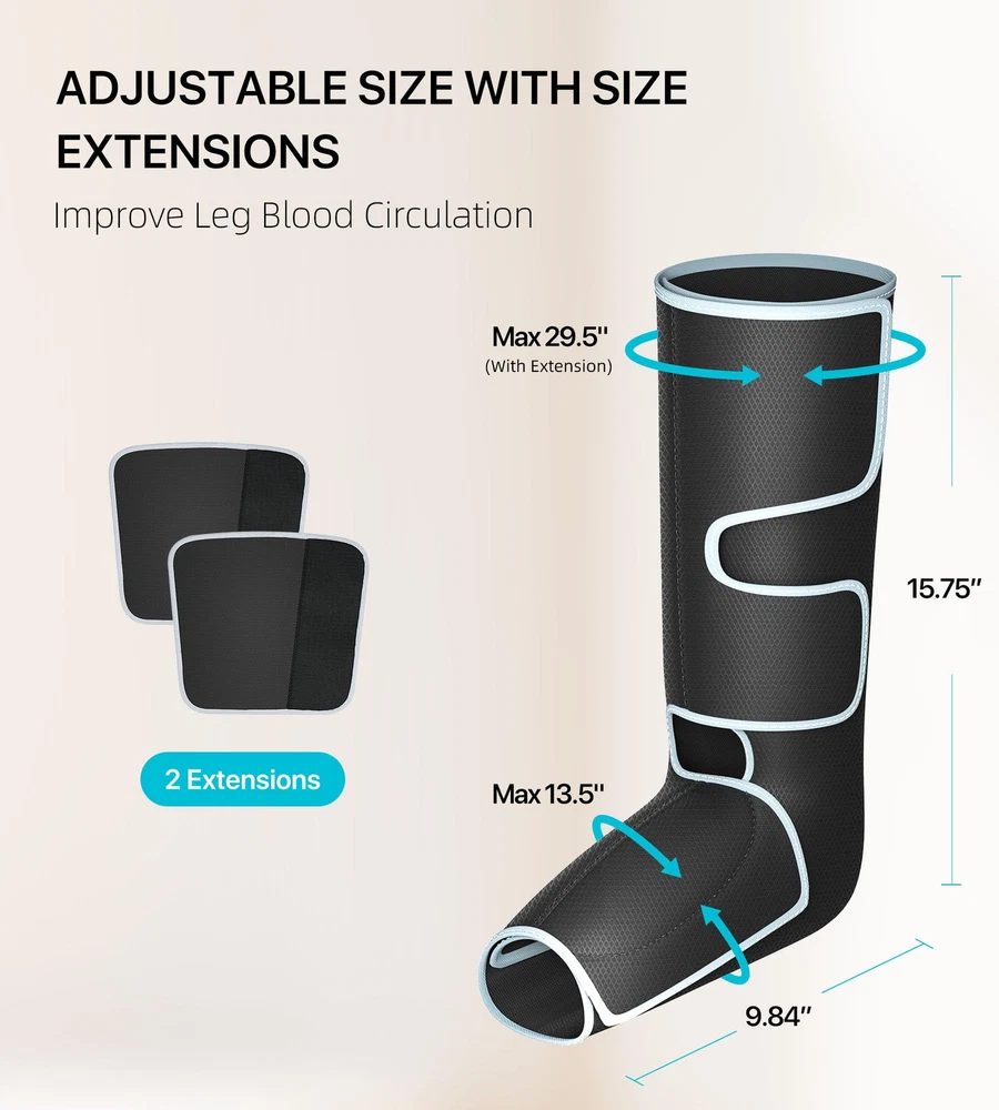 LEG MASSAGER GIFTS FOR DAD MOM: On Mother's Day, Father's Day, birthdays, Valentine's Day or any special occasion, surprise your beloved ones—Mom, Dad, or that special man or woman—with this thoughtfully prepared leg massager. Designed specifically for the feet up to the calves, it combines advanced air compression massage with heat therapy to effectively alleviate varicose veins, muscle fatigue, cramps, swelling, and edema. With this considerate and caring gift, bring them an unprecedented relaxation experience and enhance their quality of life 2 HEAT LEVELS 4 MASSAGE MODES 4 PRESSURE INTENSITIES: Heat, massage mode and massage intensity can be freely selected to meet the relaxation needs of different parts of your muscles and to adapt to the strength capacity of your leg muscles. Precisely designed airbags allow you to enjoy a 360-degree wrap-around pressing experience, and the 2 heating function (42℃/52℃) combined with the appropriate pressing intensity can effectively relieve leg edema and muscle soreness while helping to recover after exercise 2 EXTENDERS - ONE SIZE FITS MOST: This foot and leg massager can wraps nicely around your calves [up to 29.5“] and feet [up to 13.8”]. Comes with 2 extenders, the size is very inclusive and can fit a wide range of leg sizes, making it ideal for home use and ensuring a comfortable fit for everyone in the family WHO NEED THIS AIR COMPRESSION LEG MASSAGER: For doctors, nurses, teachers, and salespersons, prolonged standing often leads to leg fatigue and varicose veins. For athletes and fitness enthusiasts, after training/competitions, leg muscles tend to become tense or muscle damage. For our elderly loved ones, as they age, their blood circulation and muscle strength gradually diminish. Leg massagers can help them accelerate blood circulation, alleviate leg pain and enhance training outcomes LCD DISPLAY, MEMORY FUNCTION, 20MINS AUTO OFF: User-friendly design makes this air compression massager exceptionally easy for our elderly loved ones to use. Equipped with a handheld controller and an intuitive, easy-to-read LCD screen, it allows for clear visualization of the current function settings. The incorporated memory function defaults to the last used mode upon startup, providing convenience. Additionally, the 20-minute automatic shut-off feature ensures safety during each use