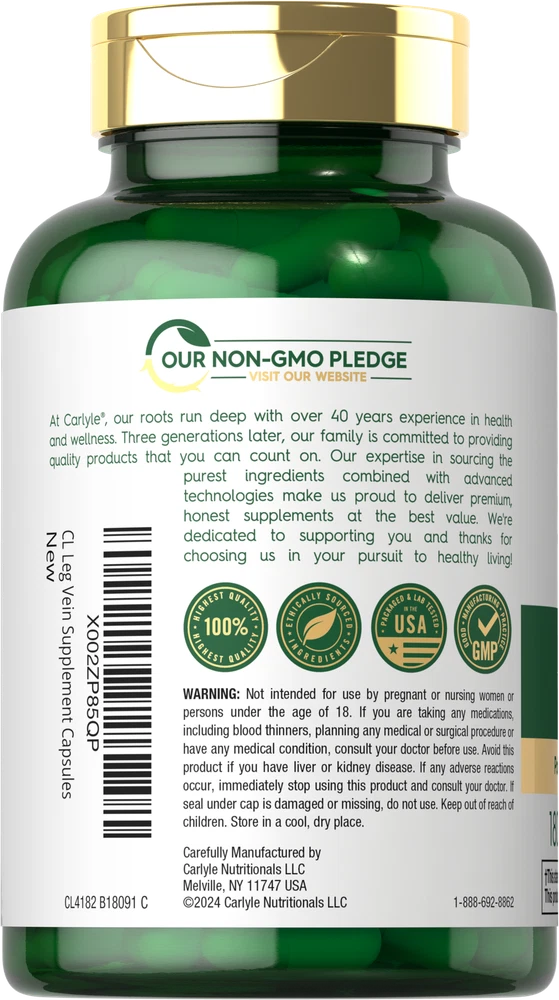 Support for Healthy Vein Function:* An active lifestyle is the best way to support leg veins. This starts with strong nutritional care and a key flavonoid compound called Hesperidin. Complete your routine today with a high-quality blend, featuring key and carefully selected ingredients and many more support factors. Carlyle Leg Vein Support:* Carlyle Leg Vein Support is the ultimate healthy leg vein supplement.* Our gluten-free and non-GMO formula features potent herbal extracts in quick-release capsules. Also included are Horse Chestnut and Grapeseed extract for additional support. Get superior value today with our 180-capsule supply! Rooted in Wellness: Our expertise in sourcing the purest ingredients combined with advanced technologies makes us proud to deliver premium, honest supplements at the best value. Carlyle Leg Vein Support* is a testament to our commitment to excellence, made with powerful ingredients rooted in wellness. Thanks for choosing us in your pursuit of living healthy. *These statements have not been evaluated by the Food and Drug Administration. This product is not intended to diagnose, treat, cure, or prevent any disease.