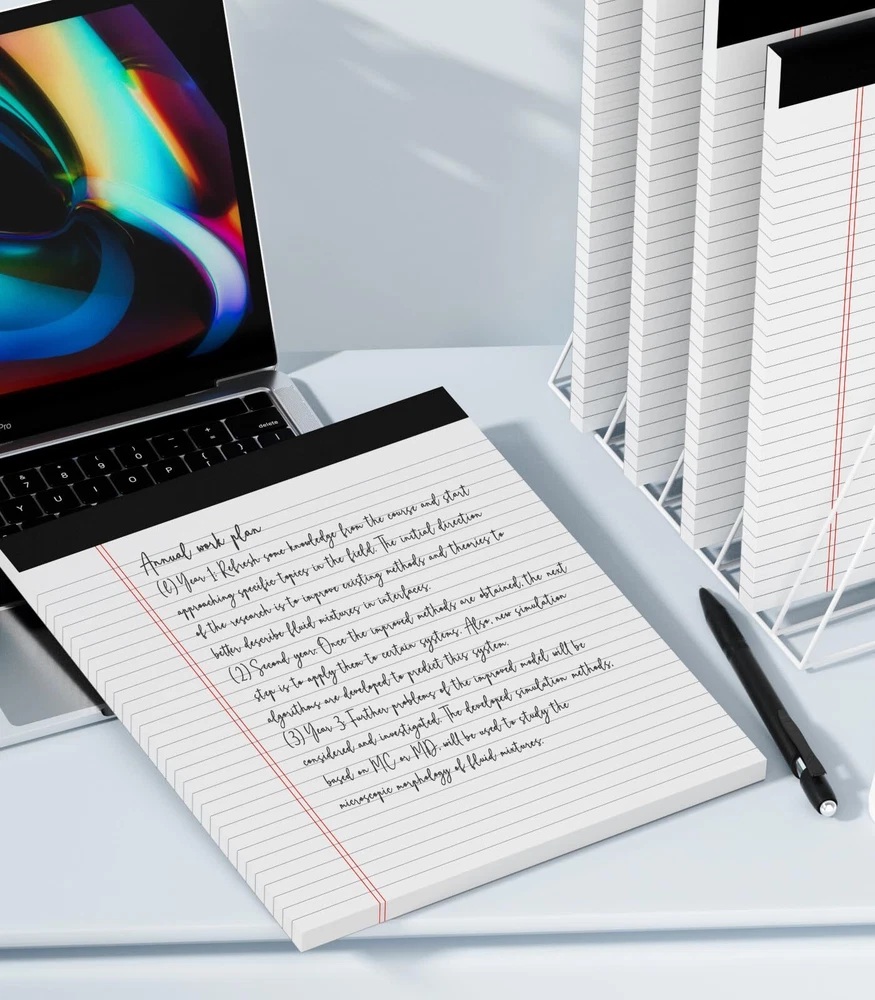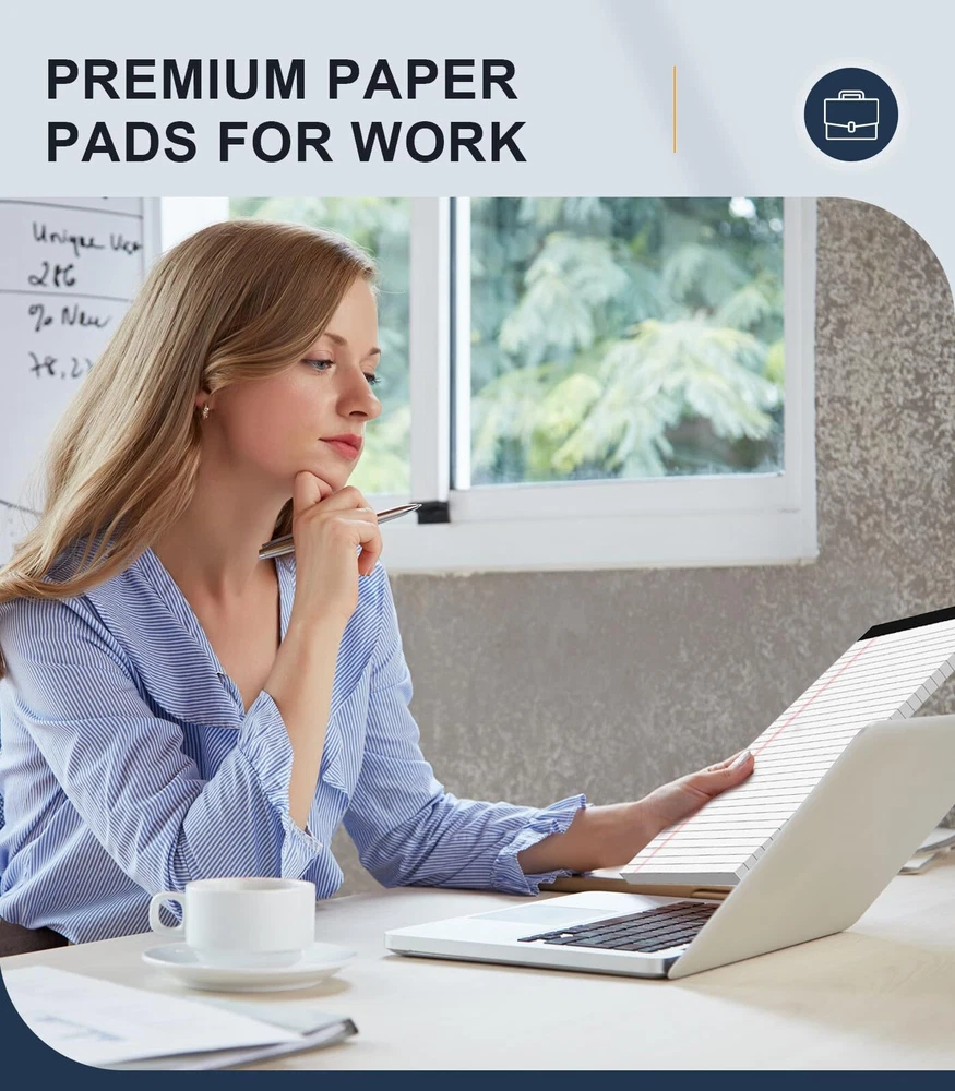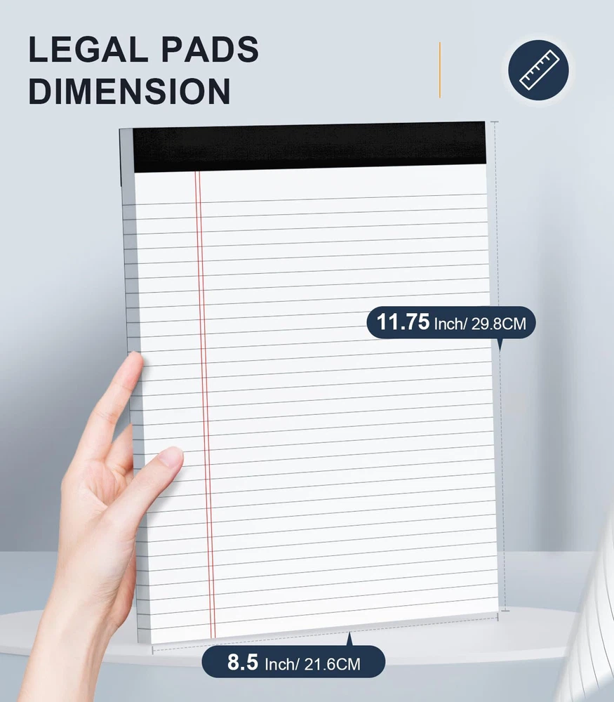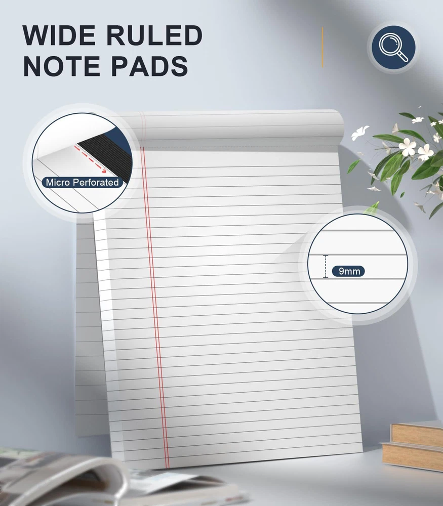 【Note Pads 8.5 x 11.75 In】: The overall dimension of each note pad is 8.5" x 11.75" (W x L, including binding). Wide ruled 11/32 inch line spacing for writing more notes on each sheet. There are 6 pads in the package, each pad include 50 sheets of double-side lines, there are totally 300 sheets/ 600 pages. Furthermore, A sturdy back made of hard cardboard allows pens to glide smoothly. ATTENTION: These pads are NOT Sticky. 【Decent Quality Legal Pads】: Comparing with other slim paper of 16lb. Our paper of pads are made of 70GSM/19LB thicken quality paper with lines, thicker at 26.6% than 15LB normal paper pad. Enjoy smooth writing experience in a reliable everyday paper pads and prevent bleeding to the back side or next sheet. Apply to various of pens. Besides, print lines on both front and back side enables you to make full use of these legal pads. Good value of legal notepads for you! 【Perforated Note Pads】: These pads features with clear perforation at the top part, making it very easy to remove from the pad when necessary. On the same time, there will not be ripping in irregular neither. Due to the wider title on the top, it provides extra spacing for writing major priority. Organizing your notes/ list/ reminder in neatly and clearly. Perfect for daily professional notes, to-do. 【White Paper Memo Pads】: These pads have a good weight and bright white color paper, It is comfortable to use and not dazzling. Widely use for These pads are great tools for students, seniors, shoppers and executives to jot down a note. You can keep on the desk or kitchen counter. Capture every inspiration/ brainstorm/ tips anytime and anywhere. Perfect for /student/ adult/ men/ women/ older. 【Great Value Quality】: You will have 6 pack of wide ruled lined notes with totally 300 sheets, 30 lines/ sheet, 8.5x11.75 Inch size paper pads are suitable for taking notes, make bulleted lists, quick notes that need to be remembered.