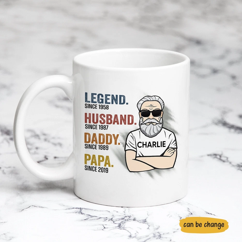 Legend Husband Daddy Papa Since Personalized Mug Dad Mug Dad Gifts Ideas Product Details.. This high quality 11oz. ceramic white mug has a premium hard coat that provides crisp and vibrant color reproduction sure to last for years. Perfect for all hot & cold beverages. The highest quality printing possible is used. It will never fade no matter how many times you wash it. Material: 100% Ceramic. Print both sides. Dishwasher and Microwave Safe. High Gloss + Premium White Finish. Printed in the U.S.A. Personalized & Custom. We support personalized and custom mug to add custom, when placing an order, you can add notes to the "order note" in shipping address section. Also you can contact us directly via message. Shipping Info. Ready to ship in 1 to 2 business days, All products are made-to-order and proudly printed in the United States. Shipped by USPS and DHL, You will receive your order in 5-7 days. Replace & Refund. All products are defective during shipping broken, chipped will be replaced free of charge. You are not satisfied with the product, we will refund 100% money to you. If any other issues arise, please do not hesitate to message, we would be more than happy to assist you.