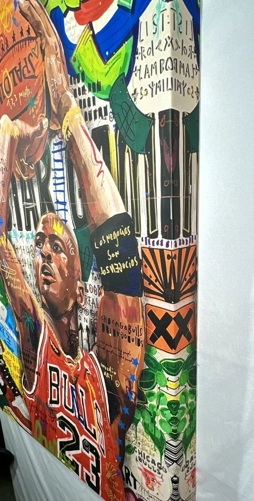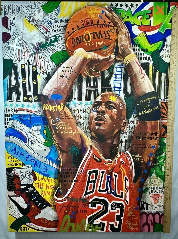 Bring home the legendary Michael Jordan with this stunning Modern Art canvas print. Measuring 28x37 inches, this licensed reprint is framed and matted, making it the perfect addition to any art collection. The portrait style print features a vibrant multi-color design, with elements of street art and pop art that truly captures the essence of the basketball legend. This canvas print is produced using high-quality canvas printing techniques, and comes with a mounting kit and certified wood. The item is a single piece, and is not personalized or signed. It's a must-have for any fan of modern art, movies, or street art. Hang it in your home or office today!