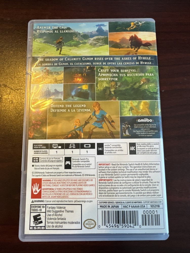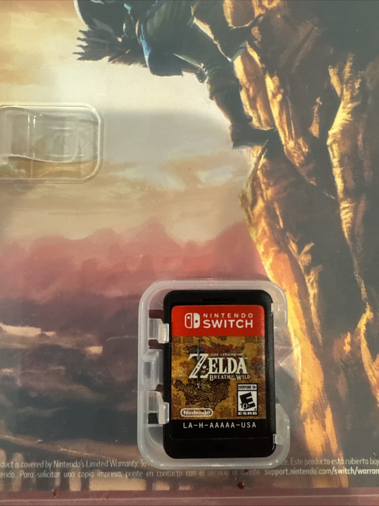 The Legend of Zelda: Breath of the Wild for Nintendo Switch is a 2018 US edition complete in box (CIB) video game. Published by Nintendo Games, this game falls under the genres of battle, role playing, and action & adventure, with an E-Everyone rating. Set in the world of Hyrule, players assume the role of Link as they embark on a vast open world adventure filled with exploration, combat, and storytelling. The game offers a complete edition experience, making it a must-have for fans of The Legend of Zelda series and action-adventure games. Plastic has wear