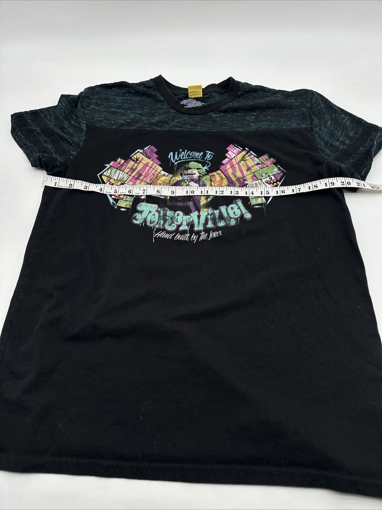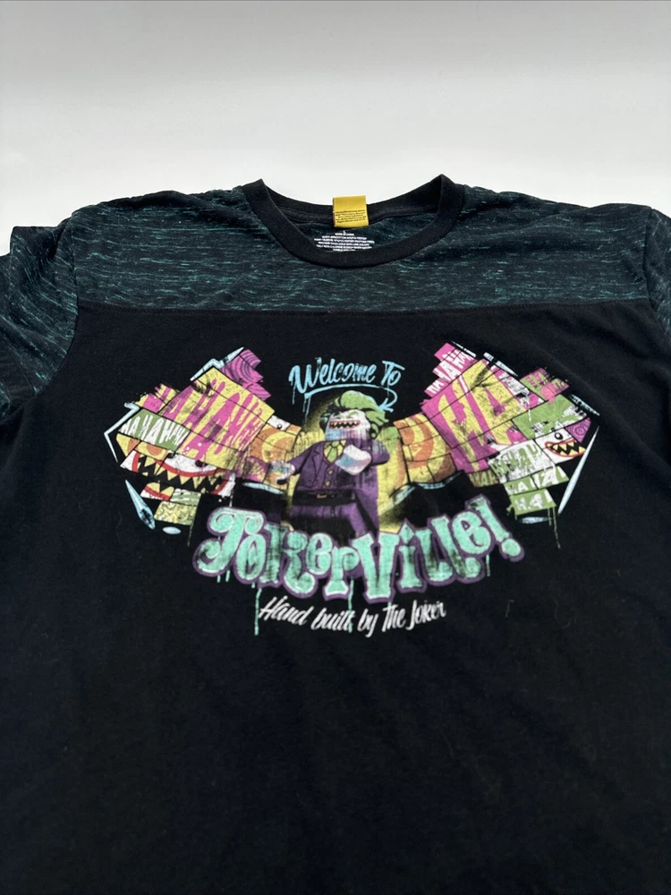 Show off your love for the Joker with this Lego Batman Movie Jokerville T-Shirt. This black graphic tee features the iconic Joker character in bold white letters, with the Lego Batman logo accenting the design. Made of a comfortable blend of polyester and cotton, this regular fit shirt is perfect for any Batman fan. The short sleeve crew neck shirt is available in size L, and is suitable for men. It is a great addition to any movie-themed wardrobe, and is perfect for casual wear. Made in China, this Lego Batman Movie Jokerville T-Shirt is a must-have for any Batman fan who wants to show off their sense of style. Check pictures for flaws and measurements