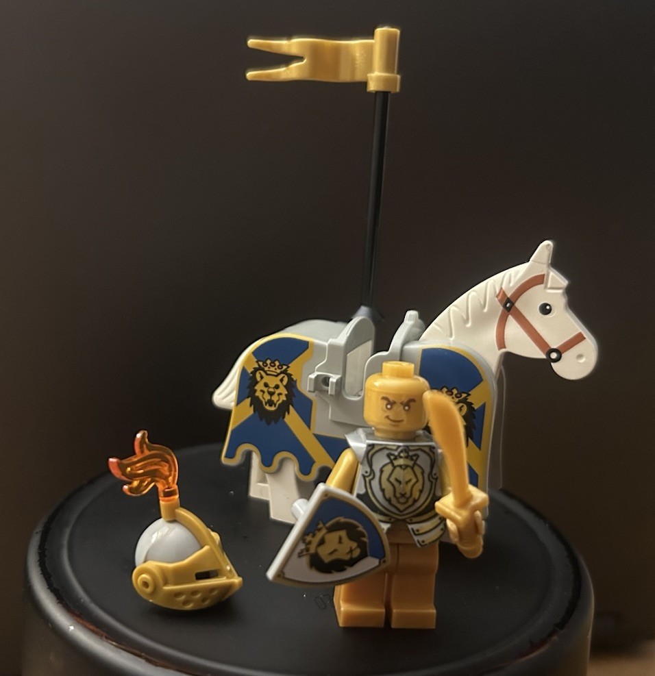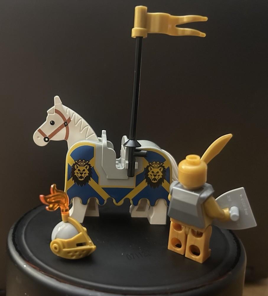 The Lego Castle Pearl Gold Guardian Knight On The Horse With Barding MOC GEM is a unique minifigure pack from the LEGO brand, featuring a Gold Knight character, Knight character, and their horse with barding. Made from durable plastic, this set comes in a polybag packaging and falls under the Castle LEGO theme. Perfect for collectors or fans of fantasy-themed LEGO sets, this intricately designed piece is sure to add a touch of elegance to any LEGO display. My own creation.