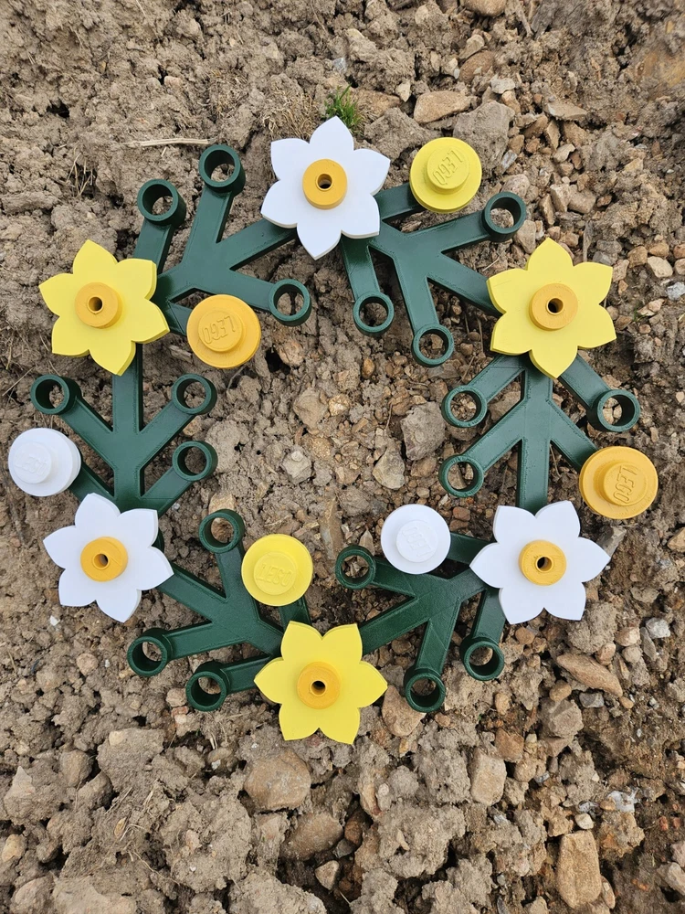 This unique wreath is a must-have for any LEGO enthusiast, gamer or young at heart. Featuring a colorful daffodil design, this 2 ft door decoration is made of high-quality plastic petals and is perfect for all occasions. Celebrate your love for SPRING with this stunning piece, made in the United States via 3D printing. Measuring 12 inches in height and width, it's perfect for both indoor and outdoor use. Whether you're looking for a gift for a loved one or just want to add a touch of fun to your home decor, this LEGO DAFFODIL wreath is the perfect choice.