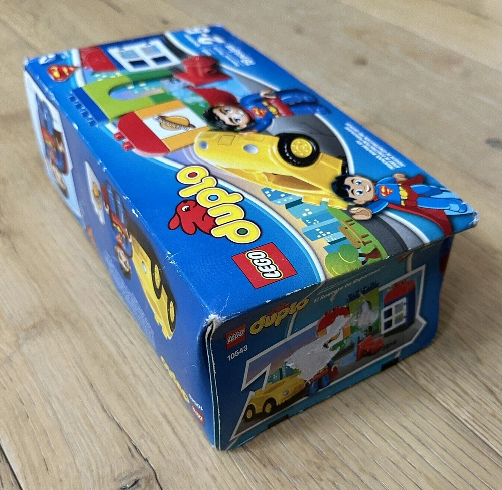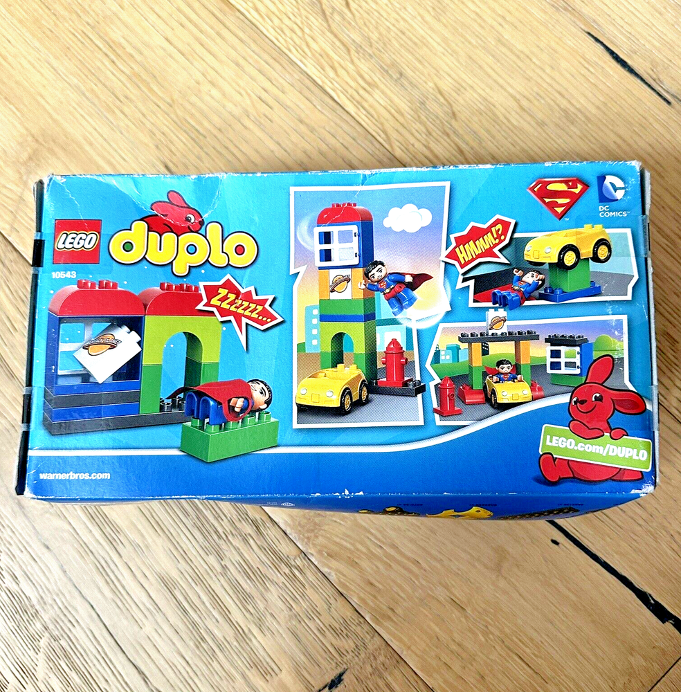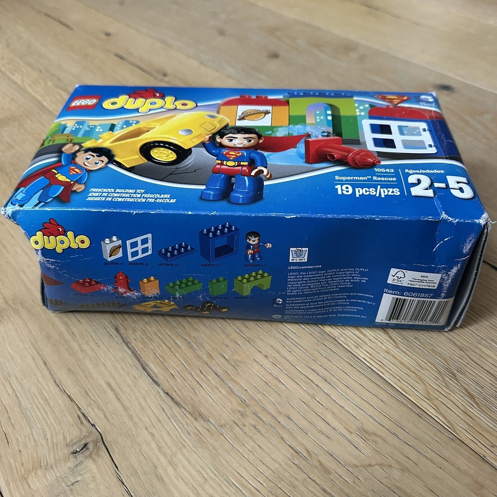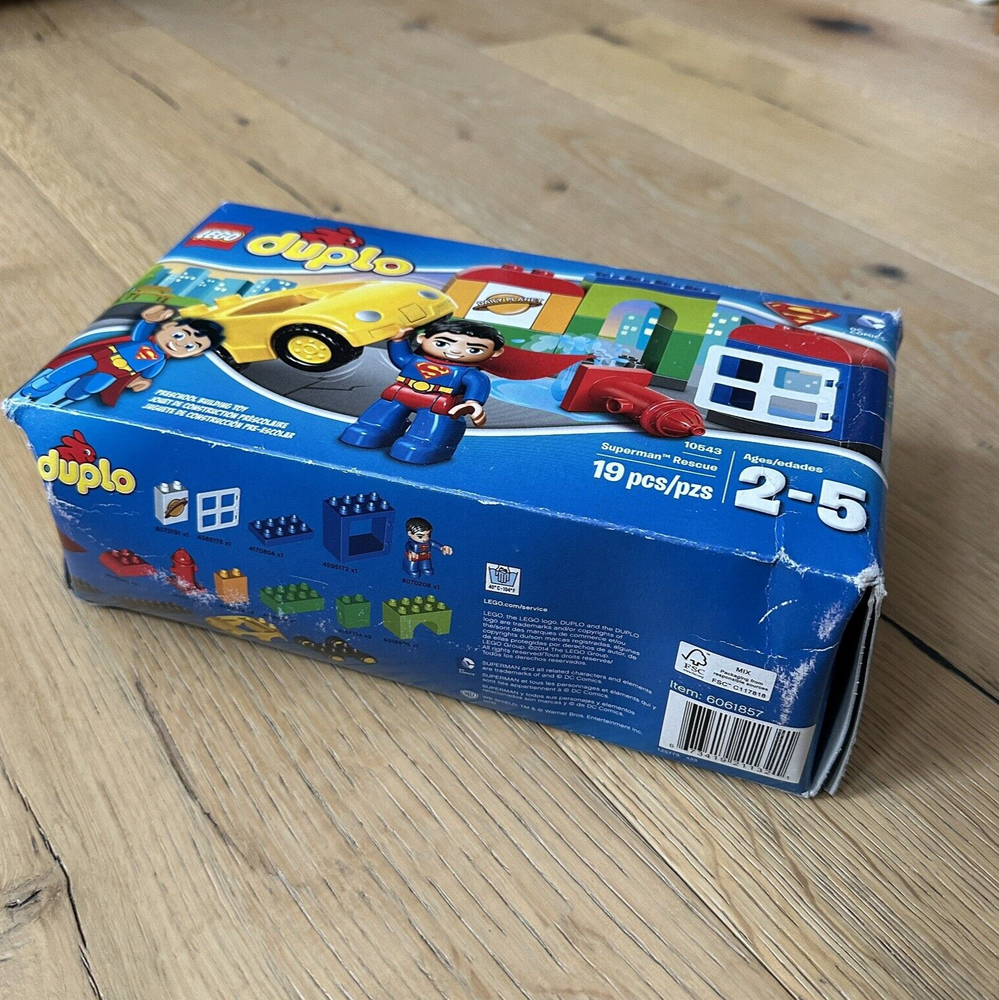 Lego Duplo 10543 DC Comics Superman Rescue NEW Still Factory Sealed 19pcs Includes Superman Figure, Daily Planet Newspaper logo block, car, fire hydrant and more! For ages 2-5 yrs New in original sealed box (see photos). Box shows lots of shelfwear with scuffs, dents or creases. You can see the original factory tape on both ends of the box, never opened. Great retired set to add to your toddler's superhero collection!