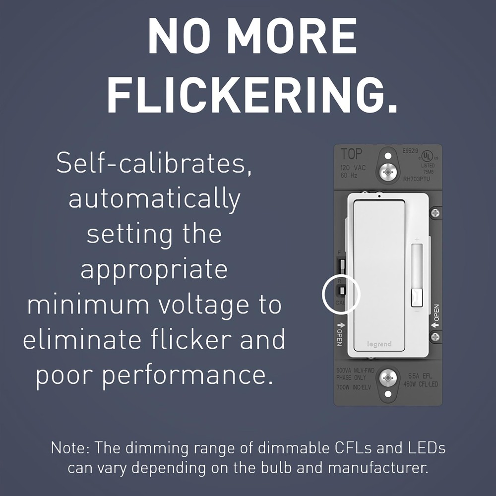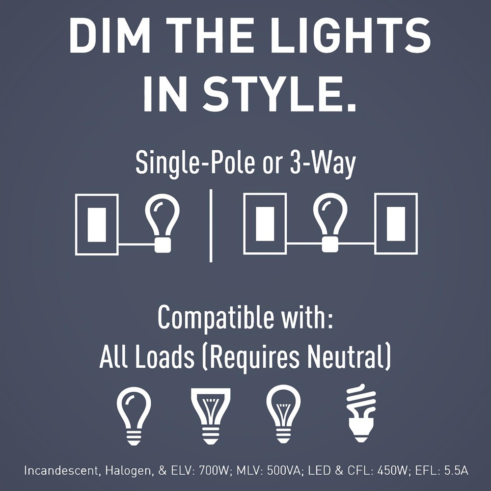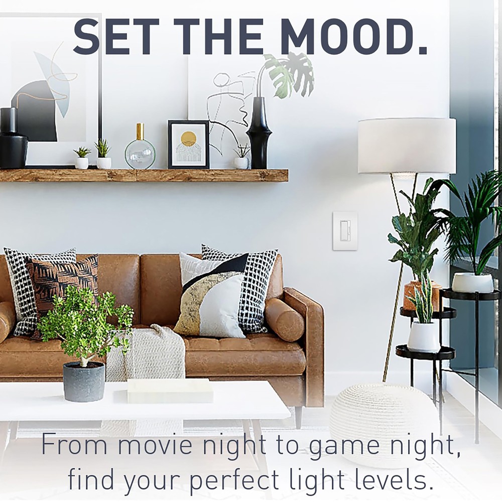 The radiant Tru-Universal dimmer offers convenient operation that combines an ON/OFF paddle switch with a separate slider for dimming control. The dimmer features a white LED light that glows when the dimmer is OFF for easy location in the dark and constant memory that returns lights to the previous level after a power failure. Included - 1 Legrand - Radiant tri-color rocker dimmer switch, 600 watts, single pole dimmer switch and rocker wall switch with LED locator Use - Ideal for large areas and open floor plans, this dimmer light switch can control a light from one location (single-pole operation) or pair with a second switch to control a single light source from two locations (three-way operation) Quality Materials - Convenient operation combines ON/OFF rocker dimmer switch with separate slider for dimming control. This dimmer also features a white LED locator light glows when the dimmer is OFF for easy location in the dark Easy to Install - All you need is 15 minutes and a screwdriver because this dimmer switch works with most common residential lighting types and three interchangeable face colors in Ivory, White, and Light Almond Function and Style - As part of the P&S Radiant collection by Legrand, the rocker wall switch is a step up from the standard with convenient operation and sleek aesthetics that complement your home