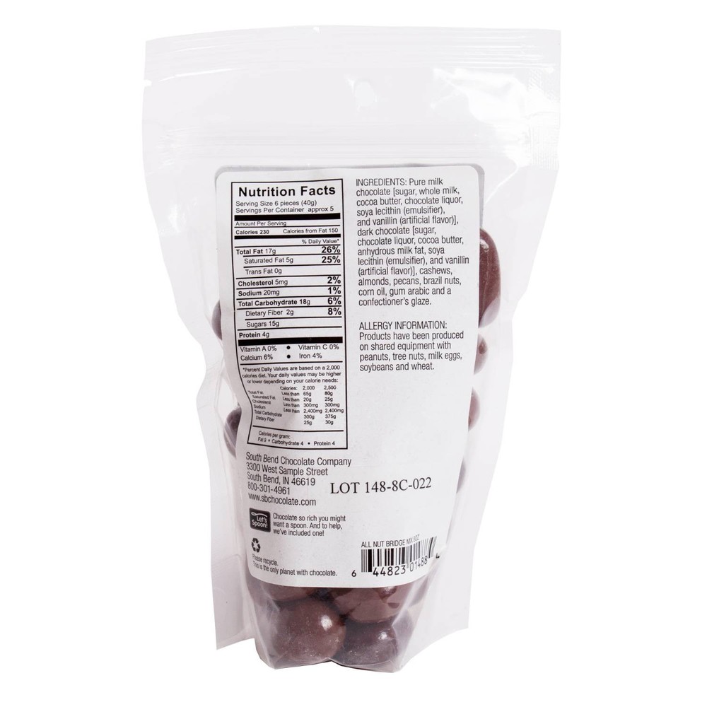 The Perfect Blend of Chocolate and Nuts Sweet or salty? We chose both! Our deliciously good all nut bridge mix combines roasted cashews, almonds, pecans, and Brazil nuts, all coated in milk or dark chocolate for a rich, crunchy treat. Enjoy by the handful. Also makes a great party snack for entertaining. Resealable bag helps keep your chocolates fresh for snack time. 8-oz bag. USA made by chocolatiers. USA made by chocolatiers. Ingredients: Maltitol milk chocolate [maltitol, cocoa butter, whole milk powder, chocolate liquor, soy lecithin (emulsifier), vanilla], peanuts, corn oil, salt, yellow prussiate of soda, gum arabic and a confectioner's glaze. Allergy Information: Products have been produced on shared equipment with peanuts, tree nuts, milk, eggs, soybeans and wheat. Visit Our Store Contact Us Lehman's Chocolate All Nut Bridge Mix - 8 oz The Perfect Blend of Chocolate and Nuts Sweet or salty? We chose both! Our deliciously good all nut bridge mix combines roasted cashews, almonds, pecans, and Brazil nuts, all coated in milk or dark chocolate for a rich, crunchy treat. Enjoy by the handful Also makes a great party snack for entertaining Resealable bag helps keep your chocolates fresh for snack time 8-oz bag USA made by chocolatiers USA made by chocolatiers. Ingredients: Maltitol milk chocolate [maltitol, cocoa butter, whole milk powder, chocolate liquor, soy lecithin (emulsifier), vanilla], peanuts, corn oil, salt, yellow prussiate of soda, gum arabic and a confectioner's glaze. Allergy Information: Products have been produced on shared equipment with peanuts, tree nuts, milk, eggs, soybeans and wheat.