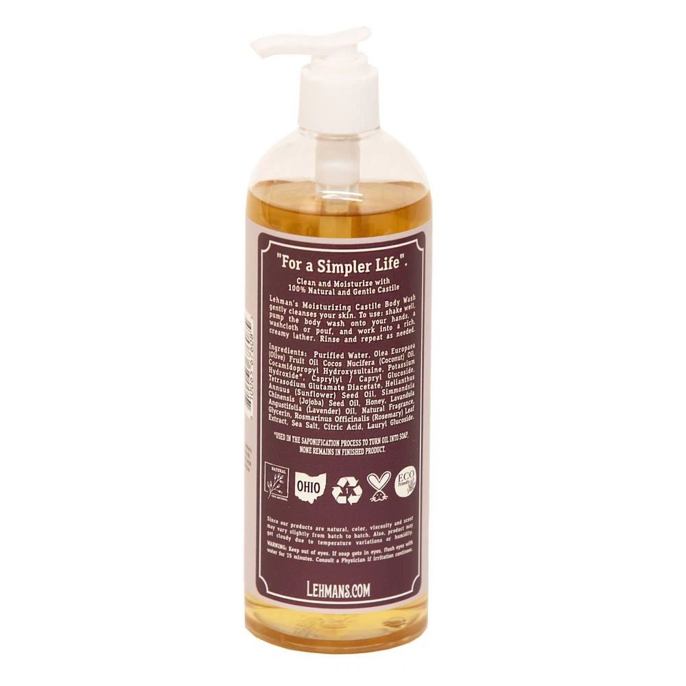 Castile Body Wash: Moisturizing and Natural! Clean and moisturize with our 100% natural and gentle castile soap. This body wash is perfect for hands, body and hair with plant-based ingredients, like olive and jojoba oil, and smells great with the added essential oils. No animal fats or oils and no synthetic detergents or preservatives to irritate your skin! Natural Formula - Made with pure honey and natural oils, including olive, coconut, sunflower and jojoba. Scented with refreshing essential oils.. Gentle on Skin - NO parabens, sulfates, artificial fragrance, artificial colors or synthetic detergents. Responsibly Made - Cruelty free. Renewable and biodegradable ingredients, plastic bottle is recyclable; 16 fl oz pump bottle. USA Made! - Made for us in Ohio Visit Our Store Contact Us Lehman's Castile Moisturizing Body Wash - 16 fl oz - Lavender Castile Body Wash: Moisturizing and Natural! Clean and moisturize with our 100% natural and gentle castile soap. This body wash is perfect for hands, body and hair with plant-based ingredients, like olive and jojoba oil, and smells great with the added essential oils. No animal fats or oils and no synthetic detergents or preservatives to irritate your skin! Natural Formula - Made with pure honey and natural oils, including olive, coconut, sunflower and jojoba. Scented with refreshing essential oils. Gentle on Skin - NO parabens, sulfates, artificial fragrance, artificial colors or synthetic detergents Responsibly Made - Cruelty free. Renewable and biodegradable ingredients, plastic bottle is recyclable; 16 fl oz pump bottle USA Made! - Made for us in Ohio Helpful Hint: Natural products may be affected by cold and humidity. Body wash can get cloudy and/or separate. Just shake it and use as normally directed. Not recommended for washing color-treated hair. Directions: Our Castile Body Soaps are great for washing hands, body and hair. Shake well and pump liberally onto a wet cloth applying to body or work into wet hair and agitating into a rich, creamy lather. Feel free to repeat as you like. Ingredients: Purified Water, Olea Europaea (Olive) Fruit Oil Cocos Nucifera (Coconut) Oil, Cocamidopropyl Hydroxysultaine, Potassium Hydroxide (Used in the saponification process to turn oil into soap; none remains in the finished product), Caprylyl/Capryl Glucoside, Tetrasodium Glutamate Diacetate, Helianthus Annuus (Sunflower) Seed Oil, Simmondsia Chinensis (Jojoba) Seed Oil, Honey, Lavandula Angustifolia (Lavender) Oil, Natural Fragrance, Glycerin, Rosmarinus Officinalis (Rosemary) Leaf Extract, Sea Salt, Citric Acid, Lauryl Glucoside.
