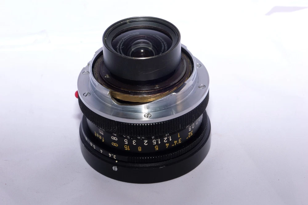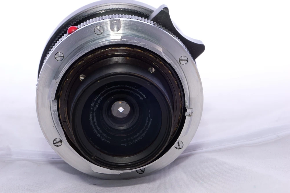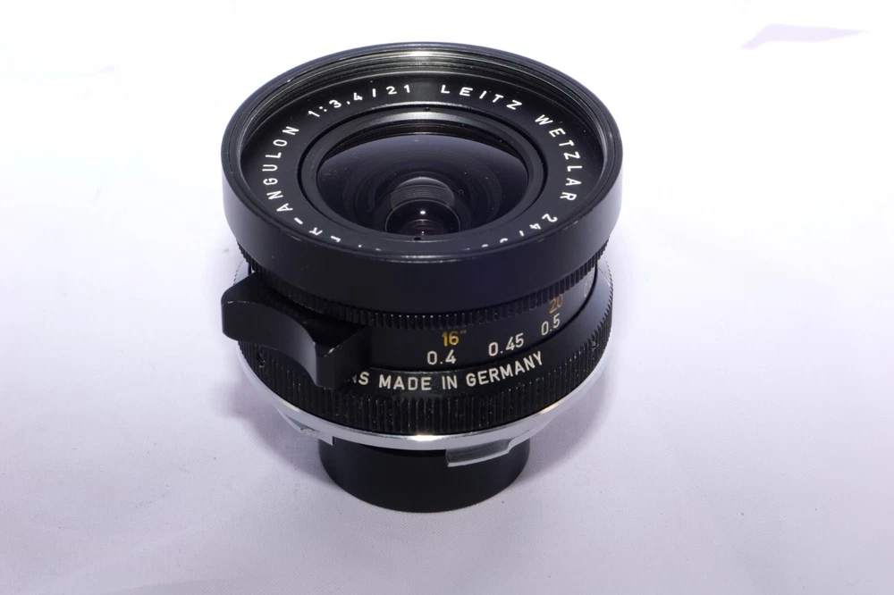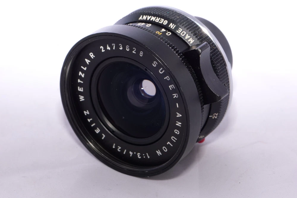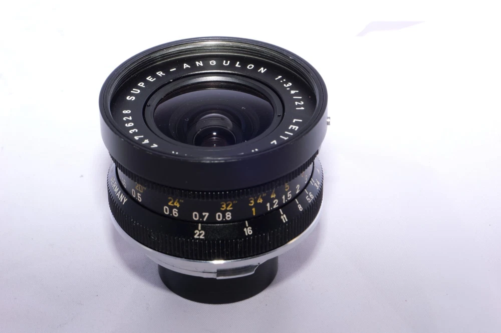 Leica Super Angulon- M 21mm f / 3. 4 black Leica M mount vintage rangefinder lens. Serial #2473628. Made in Germany. Circa 1971. Cat. #11103. Perfect fit for the Leica M1, M2, M3, M4, MDa, M5, M6, M7 and Leica MP. Comes with original Leitz 21mm black Viewfinder. Eight (8) lens optical elements. Filter size is E48. Close focusing from .4m or 16 in. Aperture range from F/ 3 . 4 to F/ 22 . Weight is 10.7 oz. Lens is in Ex/Ex+ or 8.5/9 of 10 cosmetic condition. No DENTS. Overall nice condition. Fairly Clean glass. Optics have recently been CLA'd and has NO haze which is quite typical for Super-Angulon lenses. Nice coating. Front element is very clean, with nice lens coating. Smooth focusing. Good working aperture. Clean and smooth aperture blades. Leitz 21mm Finder . Catalog #12002. Finder is in Ex++ or 9 of 10 cosmetic condition. No DENTS or dings. Clean optics. Leitz 12501 lens Hood. Hood is in Ex- / User or 6 of 10 cosmetic condition. Visible marks, but works fine.. Comes with original Leica 12501 Hood, Leitz rear cap, Leitz projector front cap, C lassic extreme wide angle lens for your lovely Leica M camera. Sells with NO RESERVE at price of $1425 . I have many other Leica M and TM lenses, Leica Film and Digital cameras, Leica Copies, 35mm Rangefinder and Vintage and Collectibles. There are always unique & unusual items on my other Auctions, eBay Store and Web Page.
