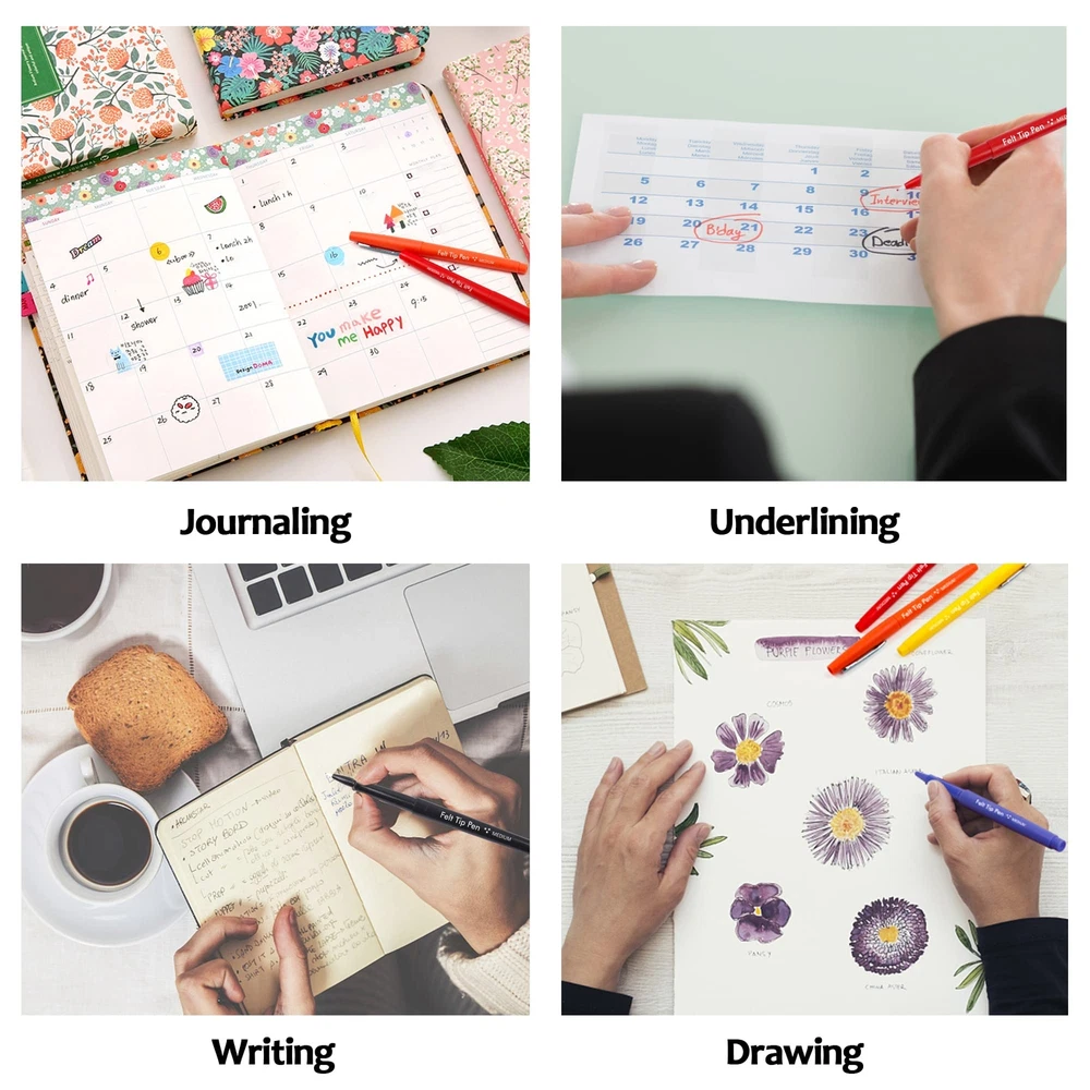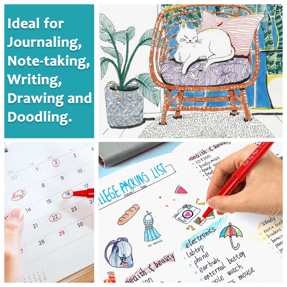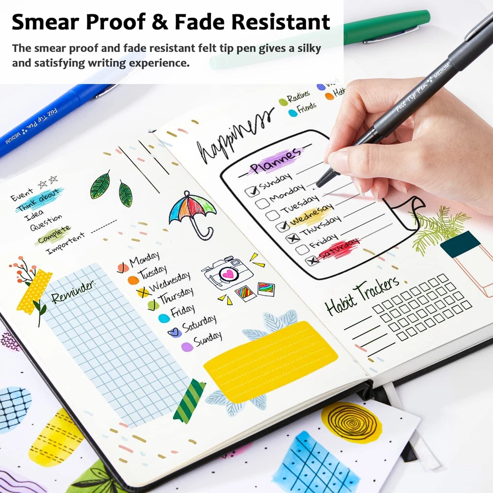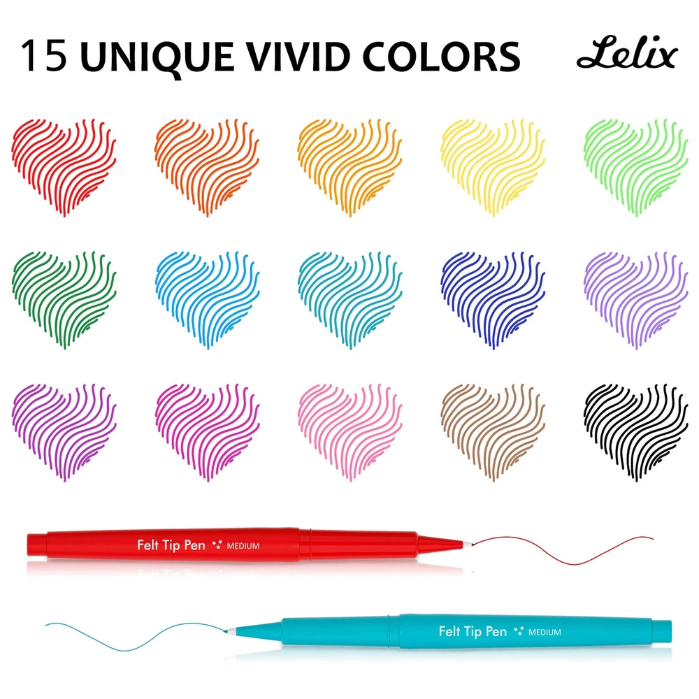 VIRANT COLORS: Lelix felt tip pens set has 15 bright and vivid colors. Versatile Felt Tip and Rich Colors can create eye-catching, vibrant impression. NO-FRAY TIPS: Lelix felt tip pens can do both detailing and filling. With no-fray medium tips, these fine point pens can extend the service life for better use feelings. UNLIMITED USES: Lelix felt tip pens are ideal for journaling, writing, note taking, planner, doodling. Also great as school and teacher supplies for drawing lines, graphs, tables, and equation. The most suitable choice for kids and adults, students and teachers. SMEAR PROOF & FADE RESISTANT: Lelix felt tip pens with high pigment, long-lasting, quick-drying ink is smear proof and fade-resistant, giving a silky and satisfying writing experience. SAFE & HIHG LEVEL SERVICE GUARANTEE: Conforms to ASTM D-4236, non-toxic, odorless, safe for both kids and adults. We will handle and solve all the product problems immediately for you. Please rest assured to purchase.